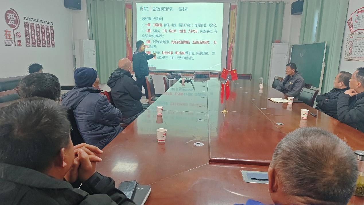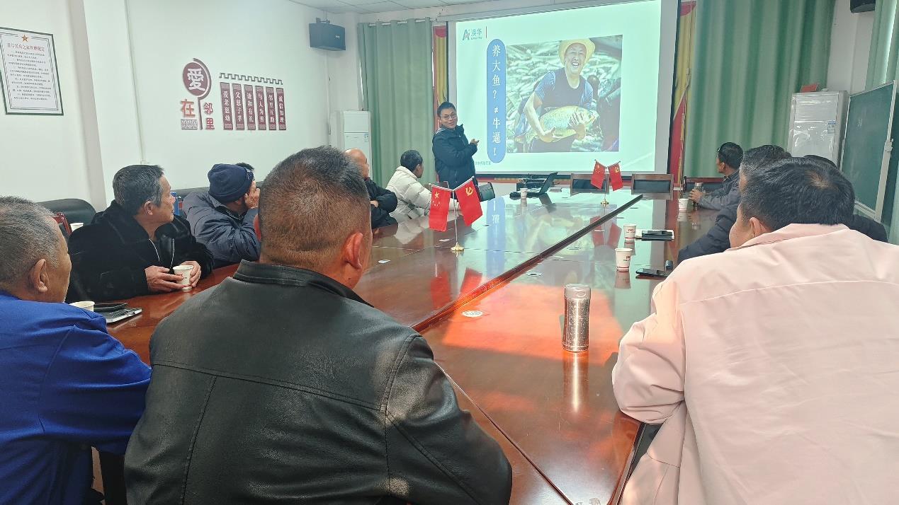 上午10时,在村会议室,朱传亚的课件以“传经送宝、增产增收”为主题,设置了“数据分析+技术实训+案例研讨”相结合的课程体系,内容包括水产绿色养殖政策、生态健康养殖模式、水质调控与尾水处理、病害绿色防控、成本管理等模块。