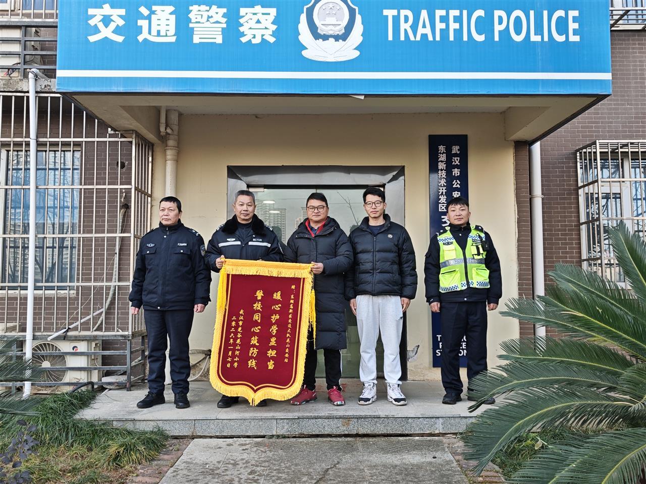 花山交安站不仅定期深入光谷三十五小开展形式多样的交通安全宣传活动,提升师生安全出行意识,更持续投入力量整治校园周边交通秩序。通过优化护学岗设置、加强上下学高峰时段疏导、严查违停乱放等措施,有效净化了校园周边交通环境,确保了师生出行安全畅通。严副校长表示:“交警同志的辛勤付出,为孩子们筑牢了安全屏障,让我们全校师生和家长倍感安心。这面锦旗代表了我们最诚挚的谢意!”