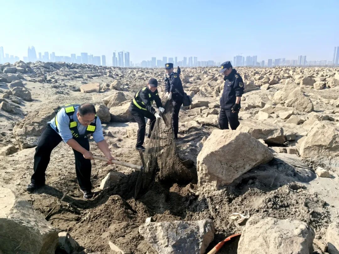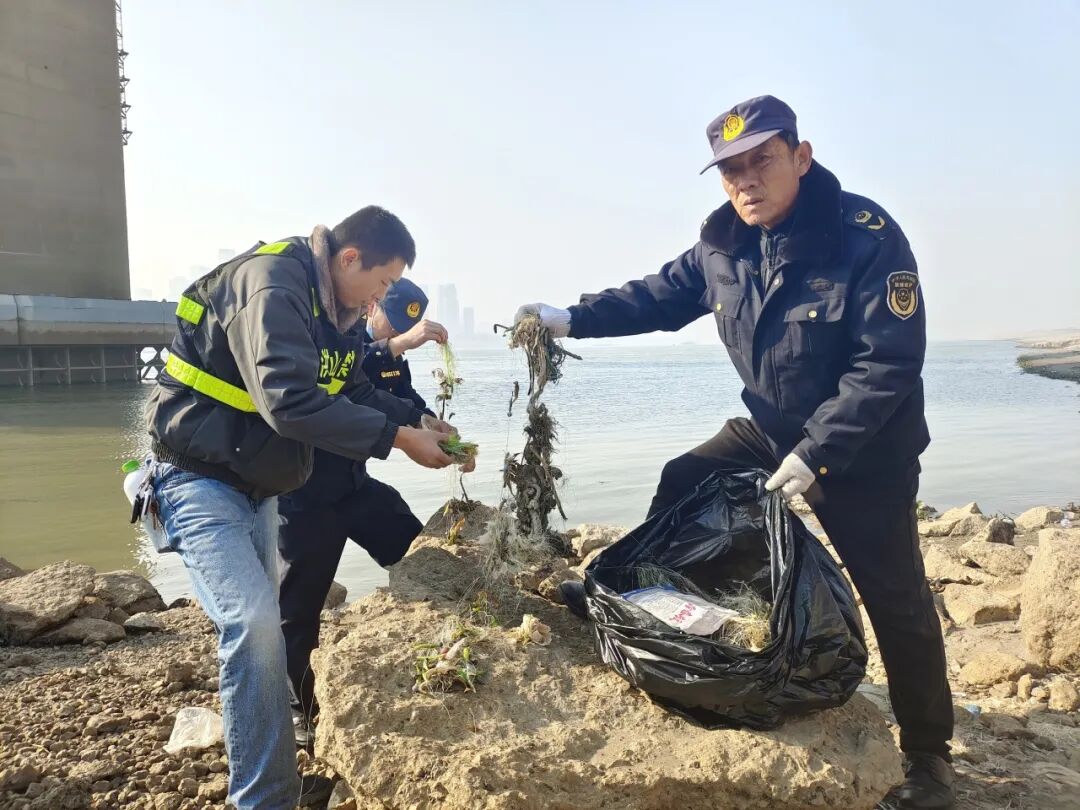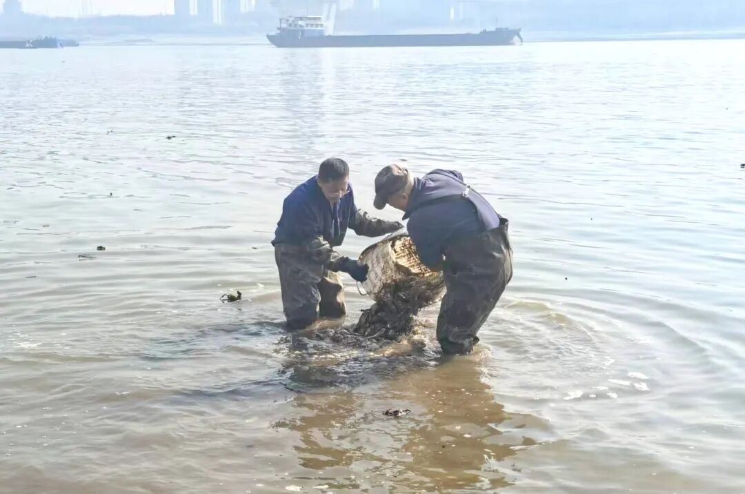 这跃动的画面,定格了洪山区“长江禁捕”三方联合突击队当日行动中最具生命力的片段。早上9点,洪山区市场监管局禁捕专班、洪山公安天兴派出所、30余名护渔志愿者登上江心孤岛,开展春节前的“生态大扫除”。