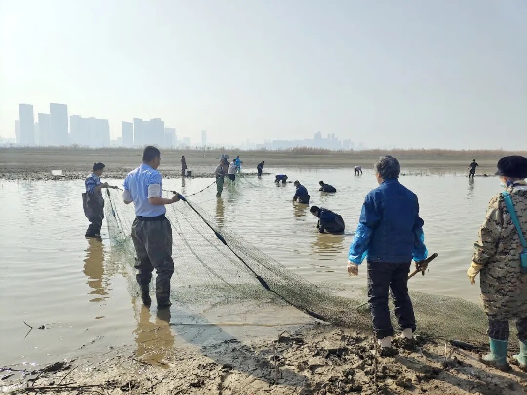 湖北日报客户端讯(通讯员 廖宇智 熊开灏)“1、2——拉!”1月13日上午,随着一声整齐有力的号子,一张张救援大网在天兴洲浅滩缓缓合拢,上万尾鲢、鳙、鲫、乌鳢蹦跳着涌向长江干流。短短几秒,鱼儿消失在滔滔江水中,围观志愿者爆发出掌声:“回家喽!”