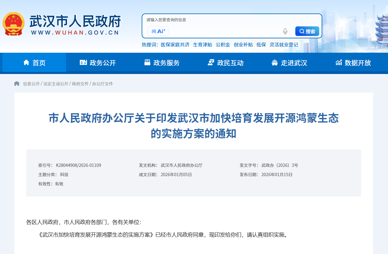 武汉市加快培育发展开源鸿蒙生态的实施方案