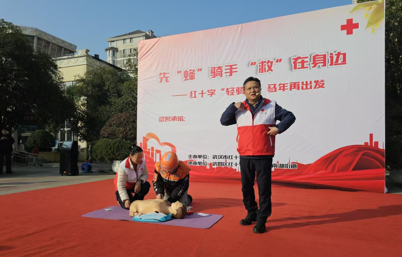 活动现场,志愿服务队党建指导员介绍活动背景与意义,武汉市红十字会负责人呼吁全市的外卖、快递小哥们,积极参与志愿服务活动,以应急救护技能守护他人与自身安全。