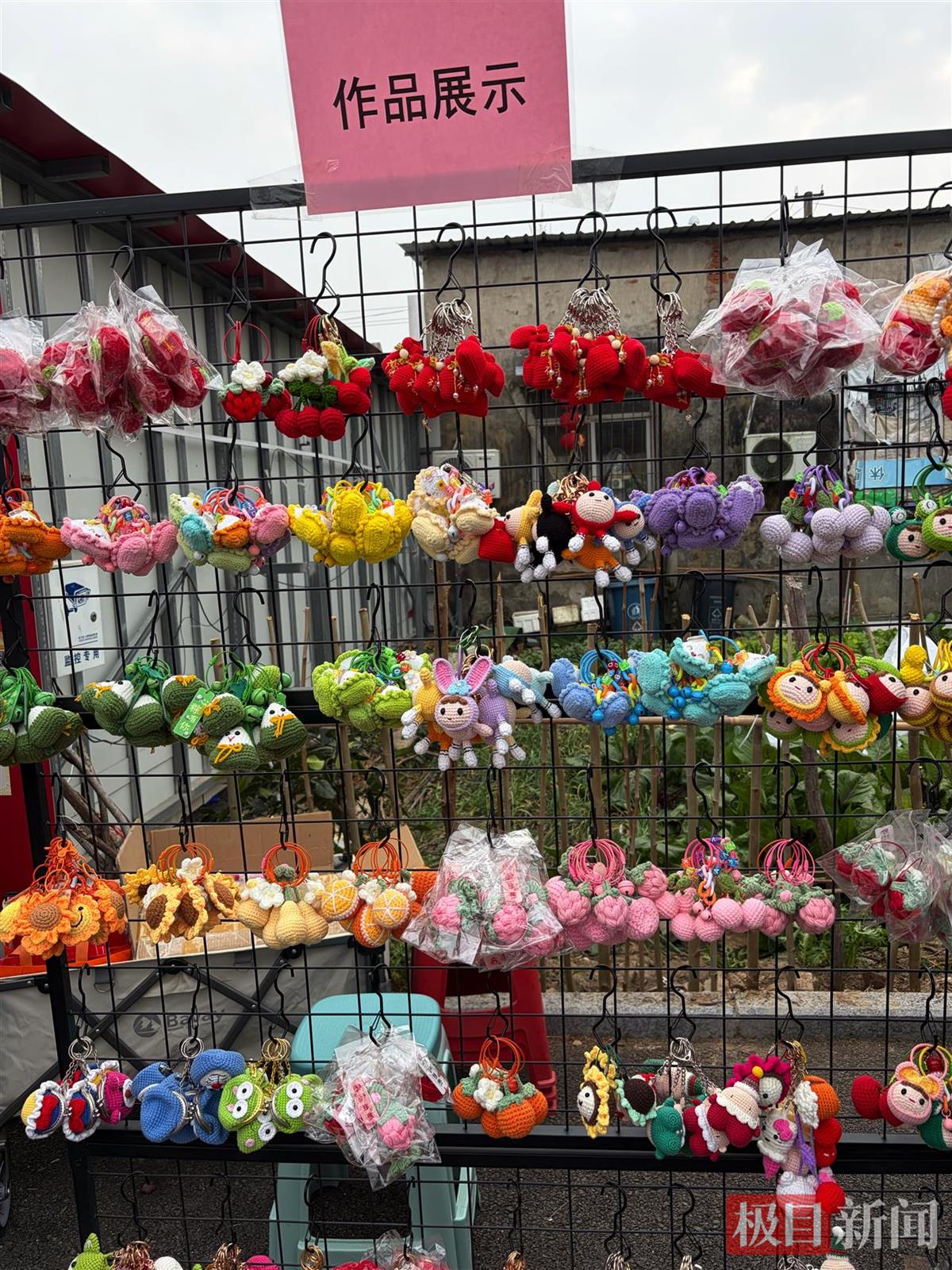 舞台附近,针织小玩偶、手工皮雕等展位吸引不少居民驻足。周芬告诉新闻记者,这些都是阳光家园的学员们制作的,通过这种形式也丰富了学员们的日常生活。
