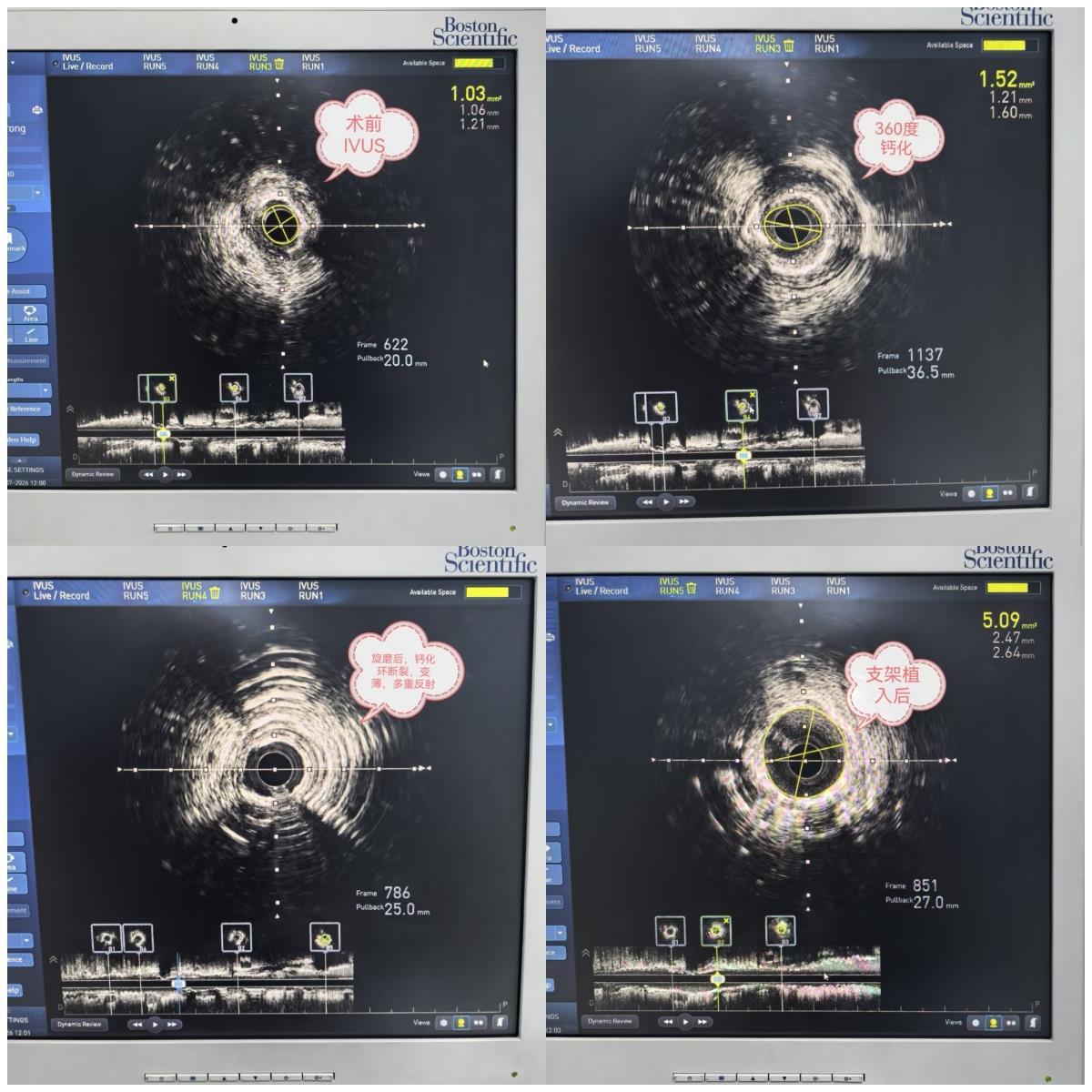 16日9时,林奶奶被推进介入诊疗中心,在多学科团队密切配合下行冠脉造影,结果显示为急性非ST段抬高型心肌梗死,且冠状动脉造影显示其右冠慢性闭塞、回旋支慢性闭塞、前降支重度狭窄并伴有严重钙化。同时,冠状动脉血管内超声示冠脉左主干至前降支中段血管内纤维增生混合重度钙化斑块,钙化呈360度环形钙化,证实了团队之前的预判,立即启动“冠状动脉旋磨术”处理钙化病变。