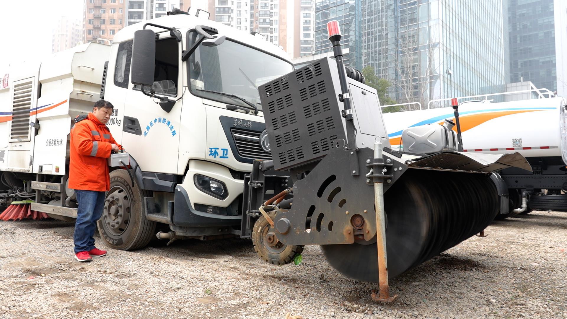 中南路清洁队对车辆安装的雪滚刷做最后调试