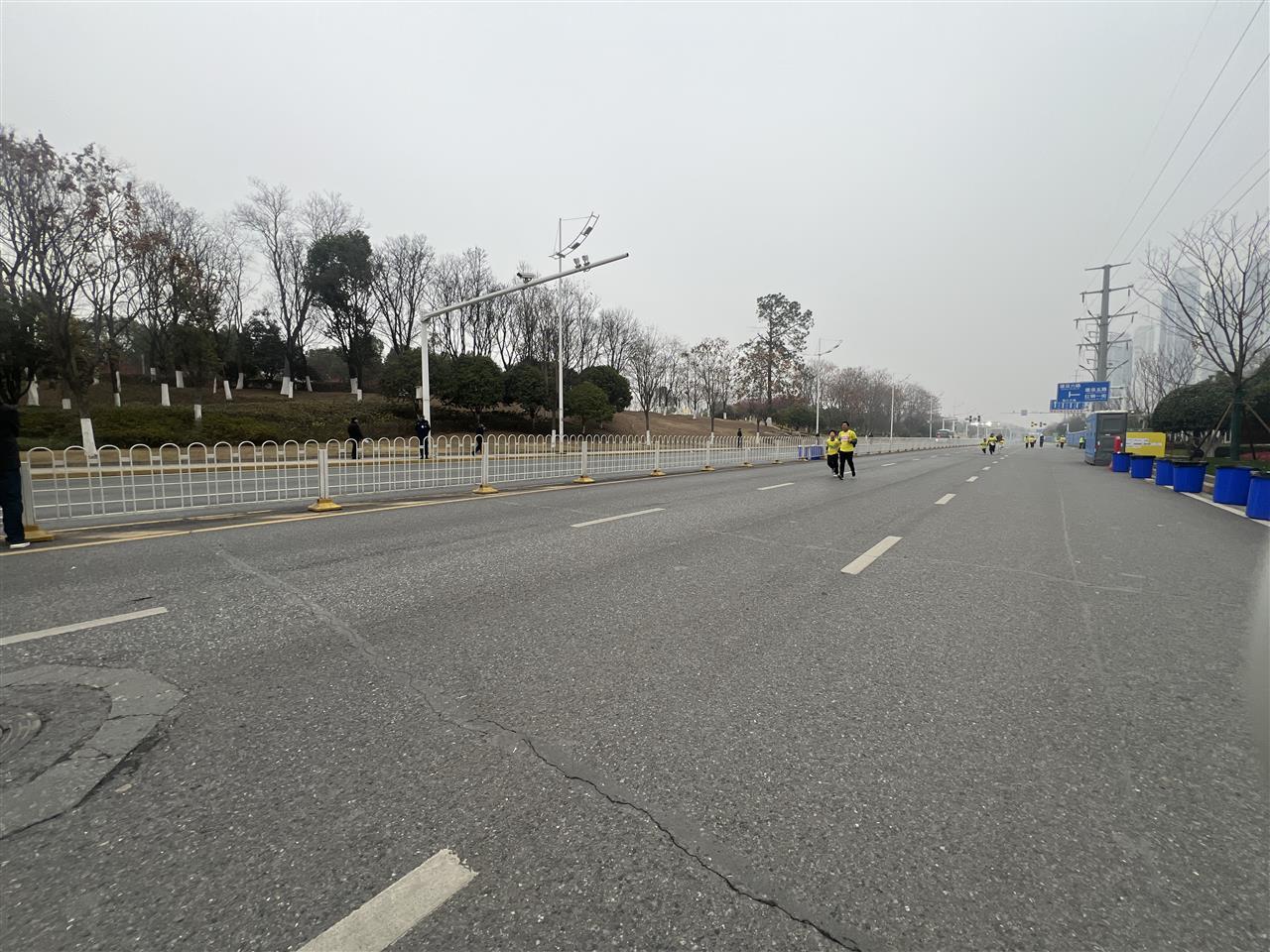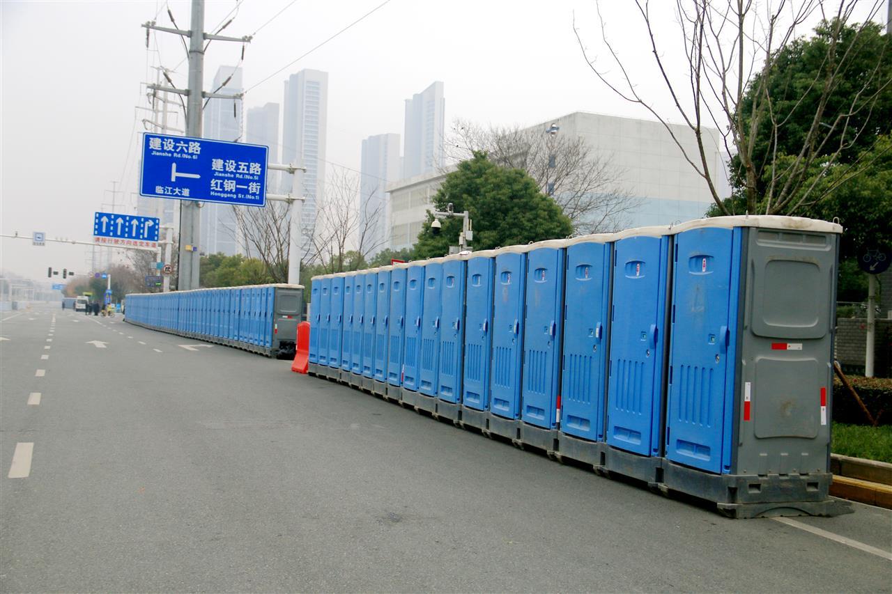 上午7时,起点处已整齐摆放了垃圾容器和移动公厕(见下图)。据青山区城管局相关负责人介绍,本次赛事在起点、终点、补给站及重要路口增设垃圾容器124个、移动公厕20个,并延长开放时间、加大保洁频次,全力保障选手及市民需求。