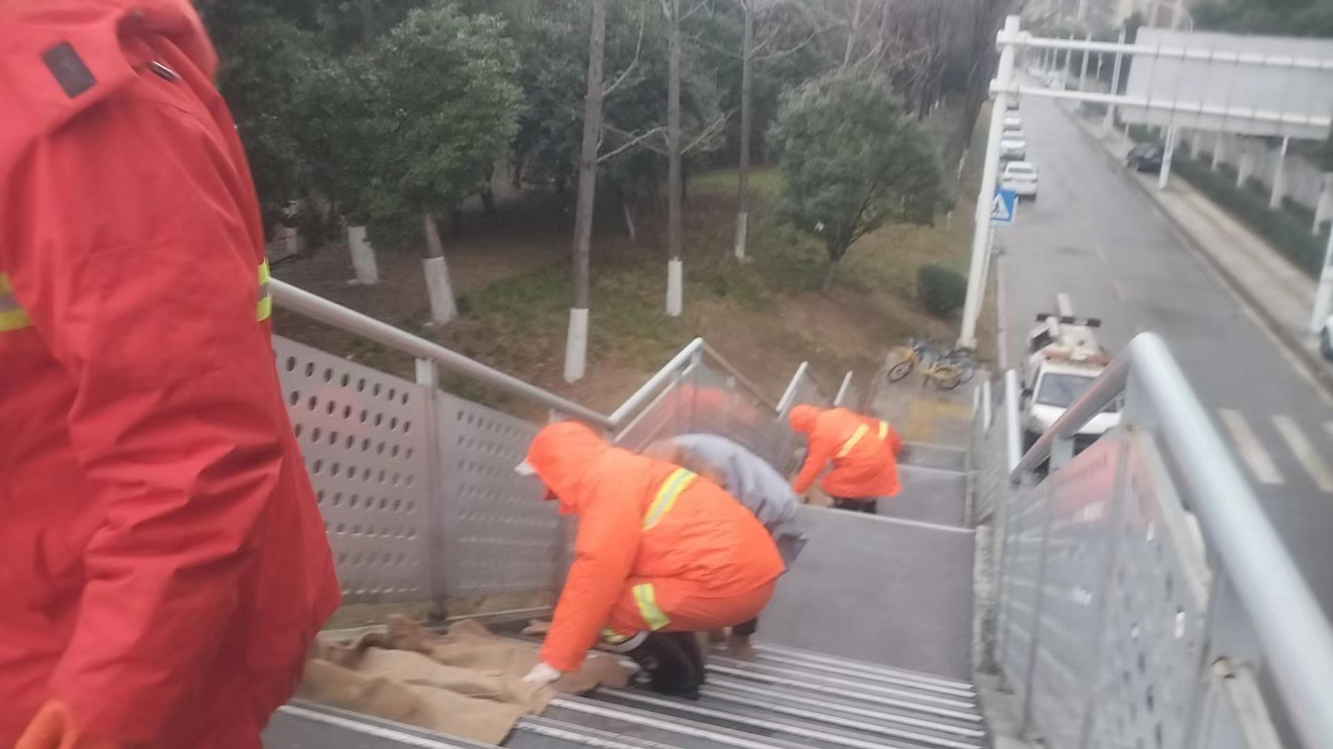 18日深夜至19日,武昌城管大桥清洁队、武汉江城天美保洁公司等按照2小时一次的要求,对城市桥梁、风口及易结冰路段进行全面测温,发现结冰现象,铺设防滑草垫和麻袋。