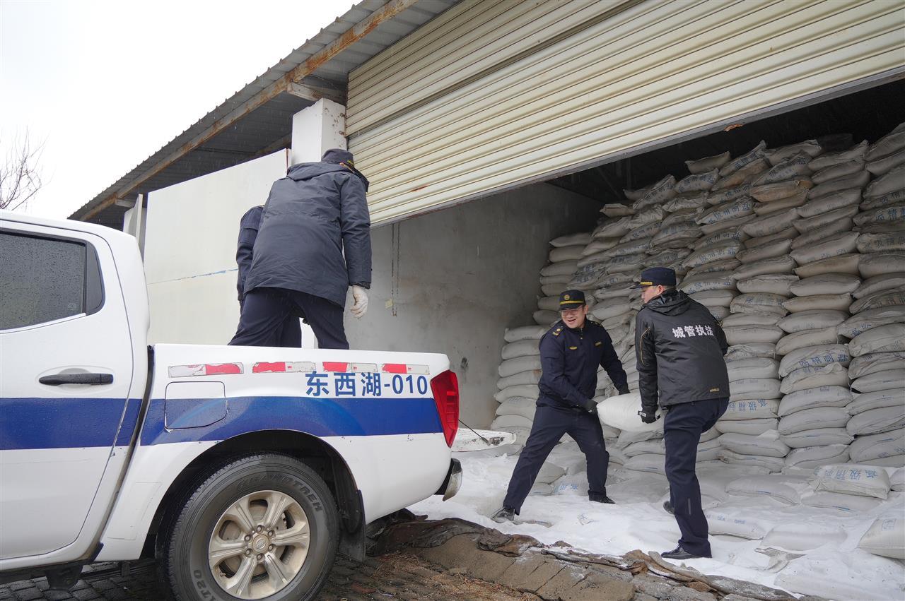 这是东西湖区迎战低温雨雪天气的一个缩影。面对低温雨雪天气预警,全区城管、环卫系统早已启动“备战模式”,23个融雪防冻应急物资储备点全面运转。目前,全区已储备融雪剂1406.85吨,草垫、麻袋约8.2万条,所有物资分类存放、专人管理,确保“调得出、用得上”。