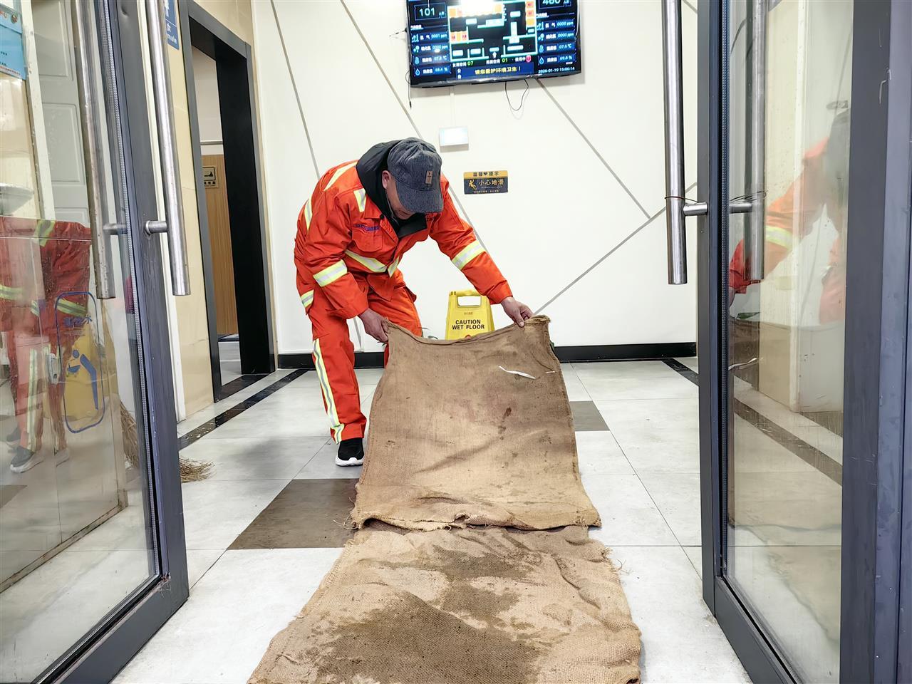在汉口青年路后襄河公园人行天桥上,环卫班长徐勤凤冒雨带着环卫工人铺设防滑麻袋,“下午下班前,还要在麻袋上预撒融雪剂,防止晚上结冰,影响市民出行安全。”就在不远处的一座公厕里,厕管员铺好防滑麻袋。
