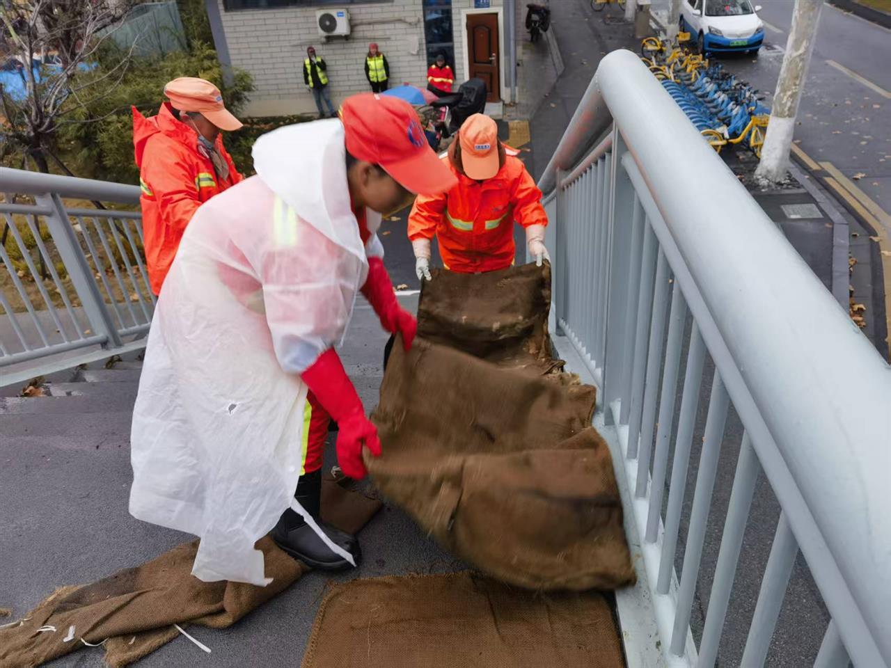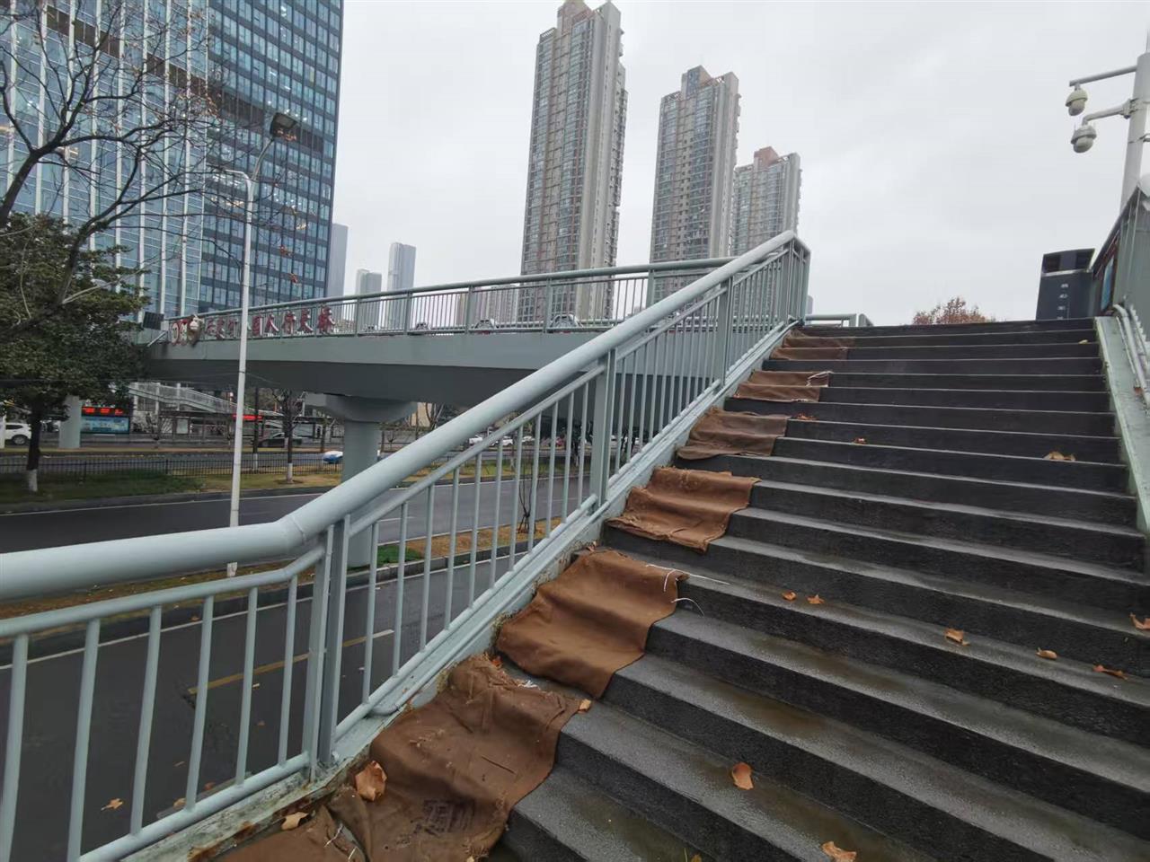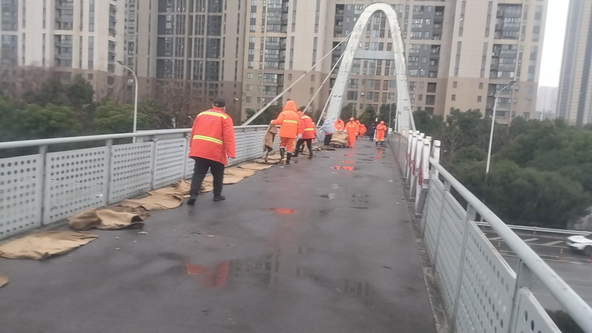 “今天大降温,上班路上,发现人行天桥上铺好了防滑垫,太贴心了。”上午9时左右,一位上班族的市民毛先生说,我要给环卫工人点个赞。