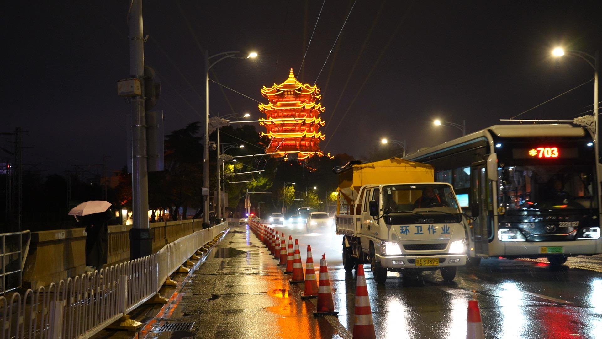 1月19日晚,武昌黄鹤楼灯火通明,照亮并见证了武汉城管人预撒融雪剂保畅通的身影。