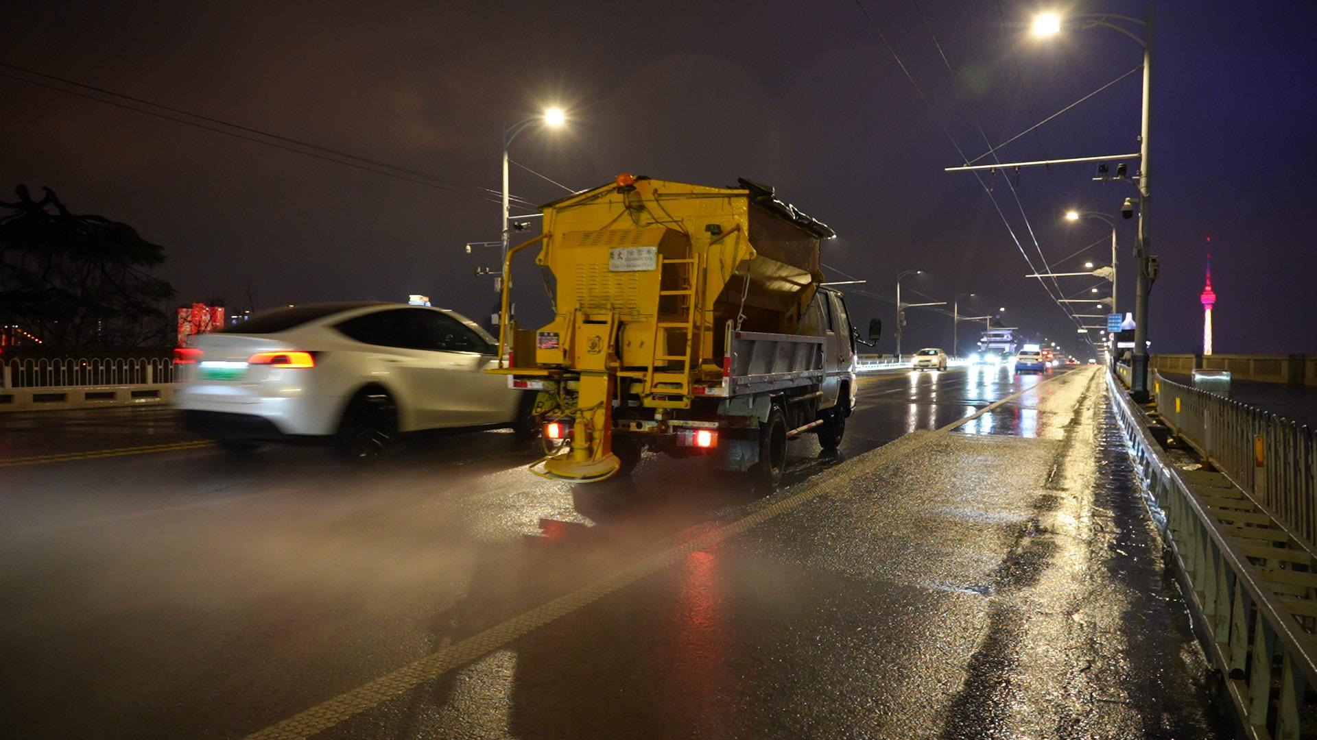 当晚8时许,武昌城管中南路清洁队值班人员在沙湖大桥例行测温时发现,因桥面风力较大,桥面气温已降至0摄氏度以下。按照预案,中南路清洁队随即启动融雪剂预撒作业,对全桥路面进行预防性覆盖,通过融雪剂降低冰点,阻断冰层形成条件。