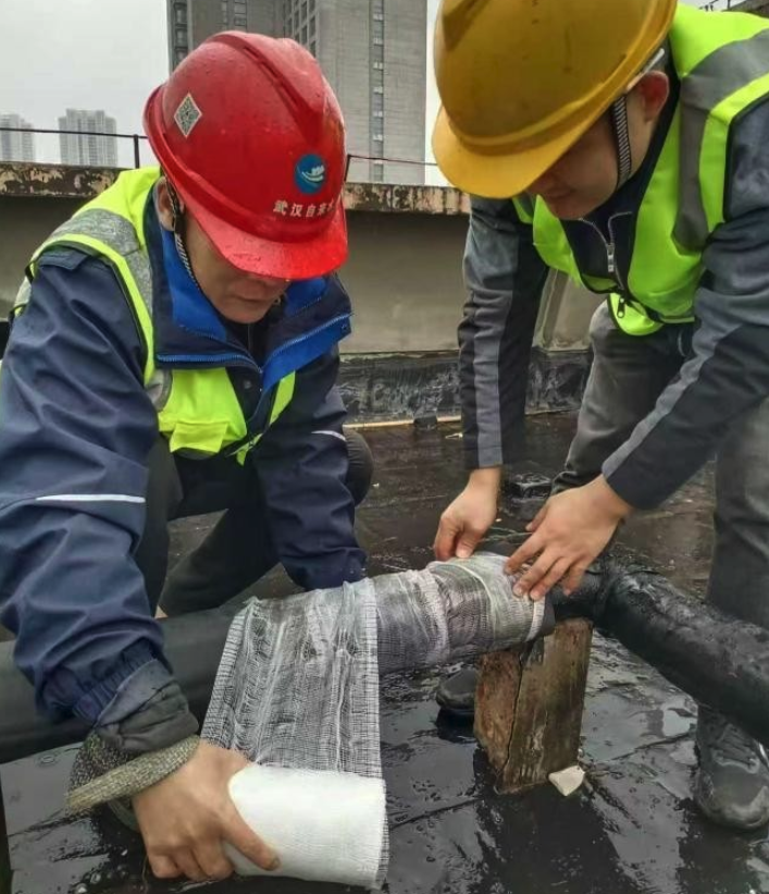 汉阳供水分公司工作人员为楼顶供水管道加装“双重保暖衣”。