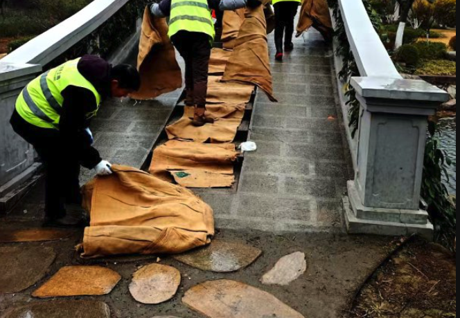 武汉市园林和林业部门已提前启动应急预案。1月19日,市区多家公园在桥面、坡道、台阶等重点区域铺设麻袋、草垫,保障市民游园安全。