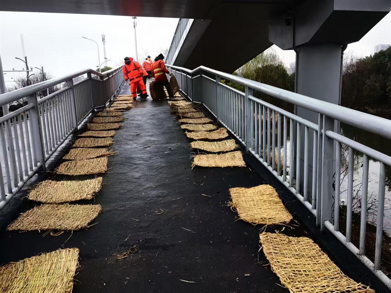 预防性布防,不仅体现在道路上,也体现在行人必经之处。早在当天17时,吴家山环山路天桥上,十余名环卫工人和执法队员就已忙碌起来。他们手脚麻利地从皮卡车上卸下一捆捆防滑草垫,沿着天桥两侧铺设开来。