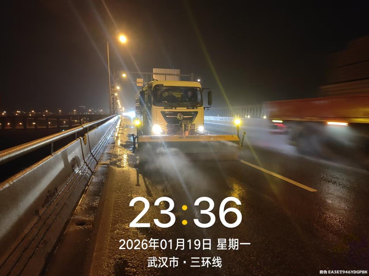 19日晚9时40分许,武汉中心城区开始下起雪籽,部分路段有了少量积雪。11时35分左右,武汉城投集团城运集团公司按照“即下即扫、雪停路净”的要求,出动雪滚车,在三环线天兴洲大桥段“飞雪”保畅通。