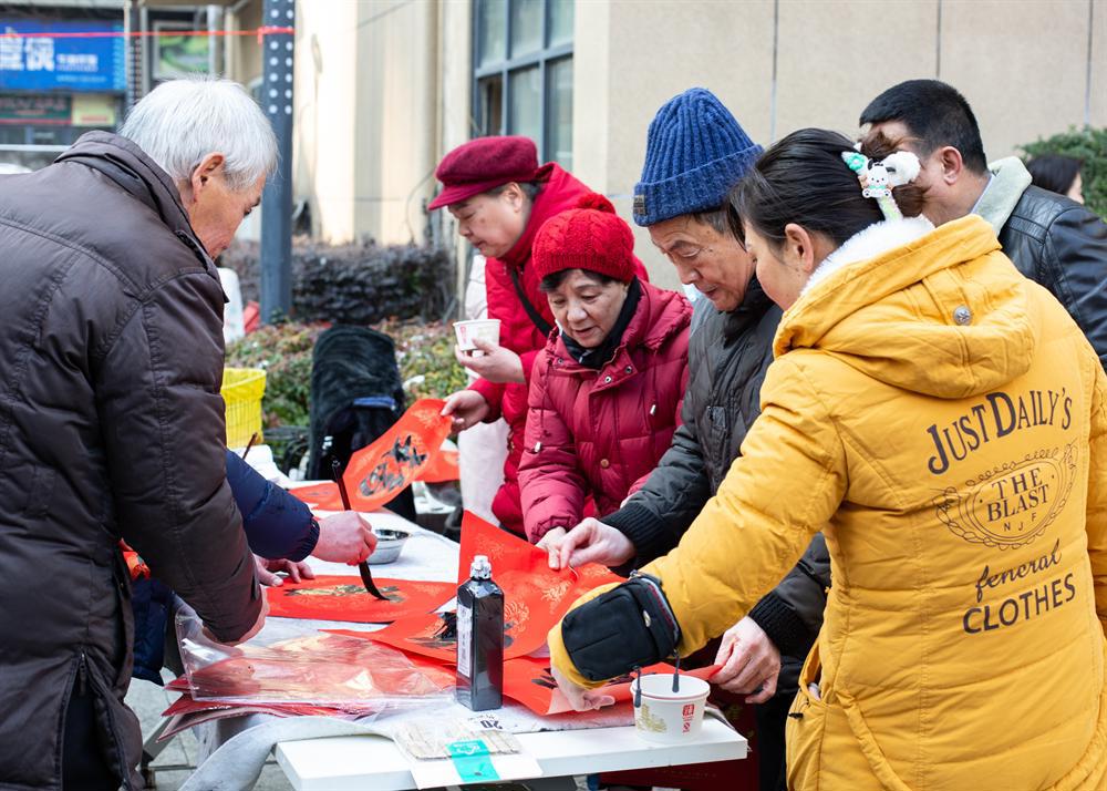 新春送福和写春联环节,成为现场最具年味的风景线。书法爱好者们挥毫泼墨、笔走龙蛇,一副副寓意吉祥的春联,一个个饱含祝福的“福”字跃然纸上,墨香与年味交织,满是对新春的美好期许。居民们或静静观赏,或挑选心仪的春联内容,不少有书法基础的居民还主动参与书写,相互交流切磋。