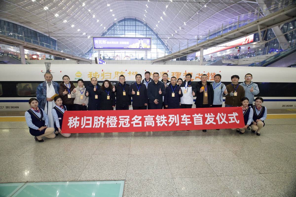 湖北日报讯(记者黄善君、通讯员史丽、胡志刚、胡蔚雯)1月23日上午7时18分,“秭归脐橙”高铁动车组冠名列车在武汉站首发。车身印有“秭归脐橙·世界理想之橙”标识的G522次列车从武汉站缓缓驶出,沿京广高铁一路北上,直抵北京西站。这标志着“秭归脐橙”高铁冠名列车正式首发,品牌传播、市场拓展迈入“高铁赋能”时代。