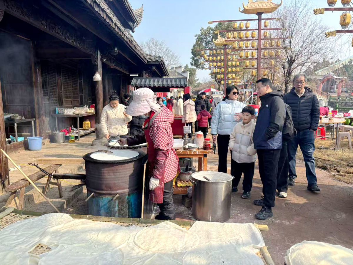 活动现场,年货展销区一个个特色摊位沿街排开,烟火氤氲间,复刻出武汉人记忆深处的年味图景。豆丝摊位前人气爆棚,刚烙好的豆丝薄如蝉翼,裹挟着绿豆与大米的清甜香气直勾味蕾,摊主现场演示切丝、晾晒的传统手艺,娴熟的技法让游客驻足围观、争相选购。打糍粑体验区更是充满欢声笑语,木槌轮番起落,将蒸熟的糯米捶打成软糯Q弹的糍粑,孩子们跃跃欲试,在家长指导下亲手参与,感受手工制作的温度,刚出锅的热糍粑裹上细腻黄豆粉,甜香四溢,一口便尝得新春的幸福滋味。