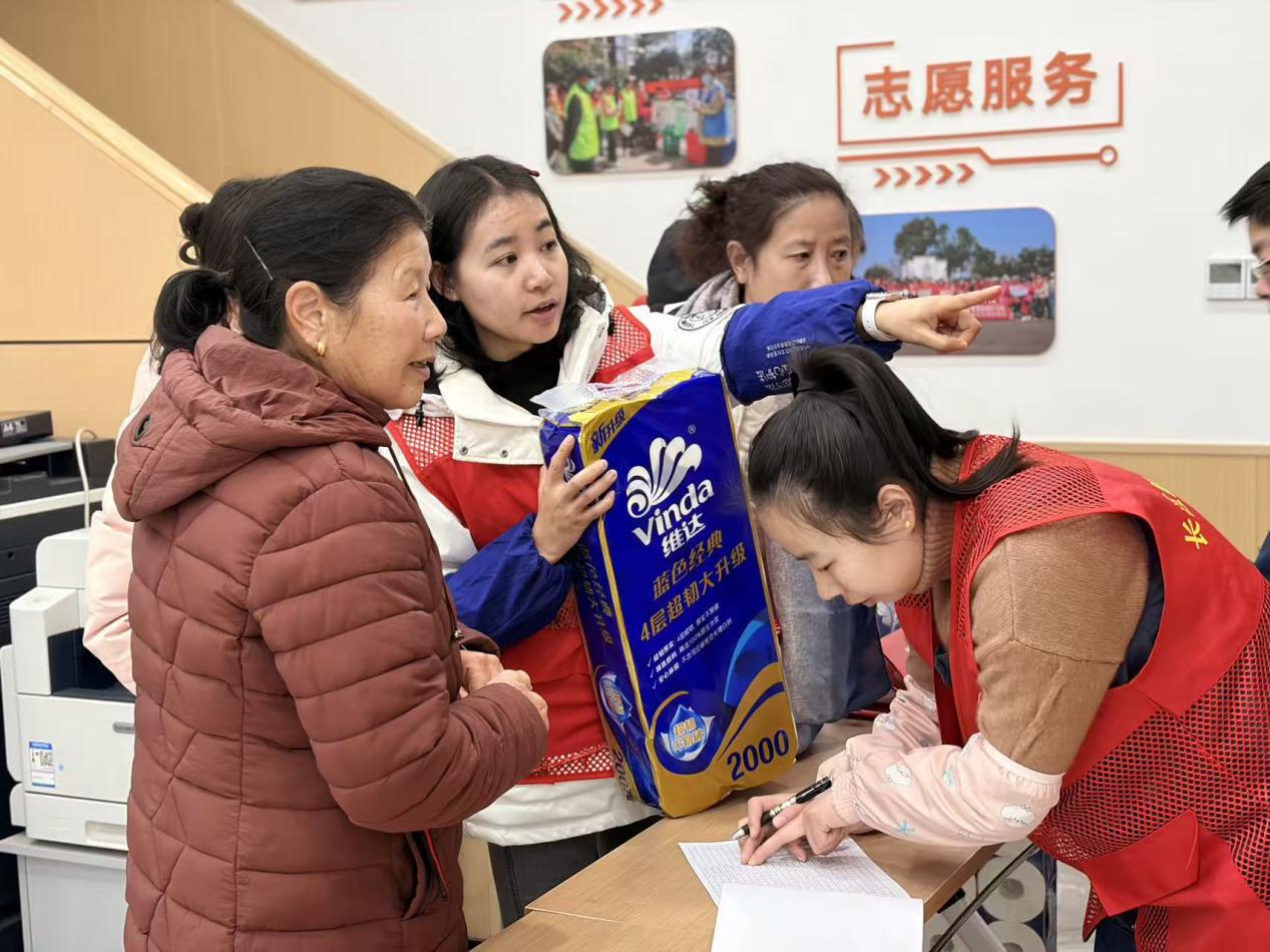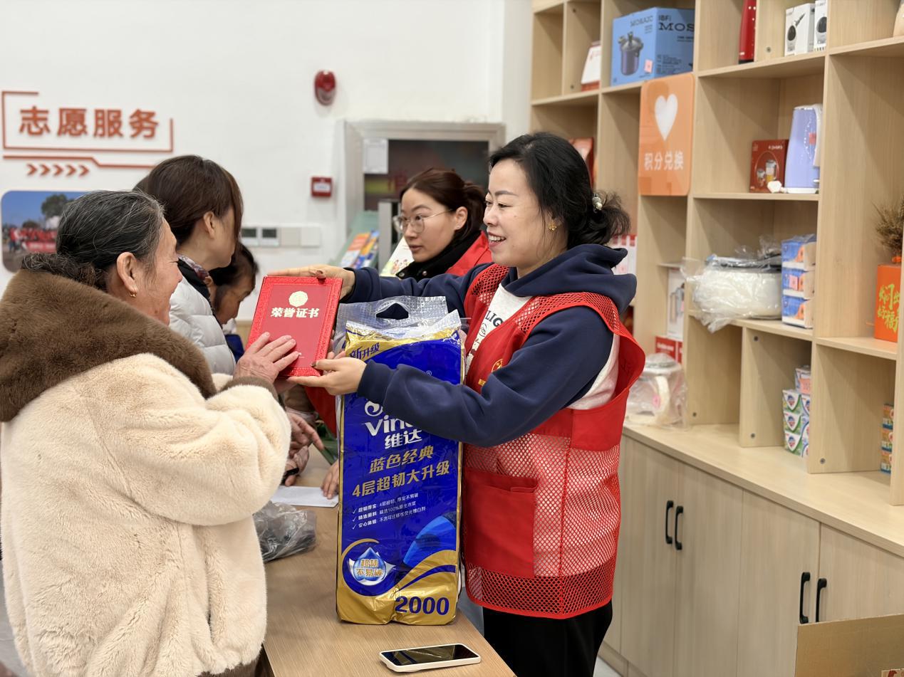 兑换过程中,工作人员耐心细致地为每一位前来兑换的志愿者核对积分、登记信息,引导大家有序挑选物资,并为优秀志愿者发放证书。“平时参与社区的志愿服务活动、清理楼道卫生,积累的积分今天终于派上用场了,兑换了一个热水壶和一提纸巾,这份‘回报’特别实在!”社区志愿者刘阿姨拿着兑换的物资,脸上洋溢着幸福的笑容。年过七旬的李爷爷是时间银行的忠实参与者,他常年主动参与社区环境整治、政策宣传等志愿服务,此次用积分兑换了一个电火锅,他表示:“参与志愿服务不仅能帮助别人,还能积累积分兑换实用服务,这种模式让我们老年人也能为社区出份力,特别有意义。”