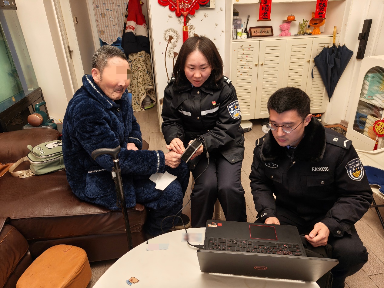 见到民警上门,老人格外开心,拉着队员的手亲切唠起家常。受低温天气影响,老人手指冰凉,指纹采集工作一度遇阻。民警袁燕、辅警何林枫见状,耐心为老人揉搓手指,沾水后反复尝试,最终顺利完成指纹采集。业务办理完后,队员还特意留下联系方式,叮嘱老人及家属,有任何办事需求可随时联系。