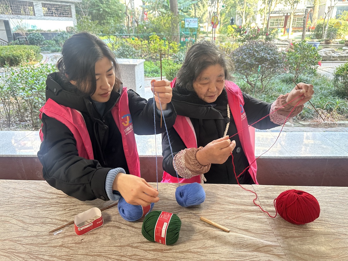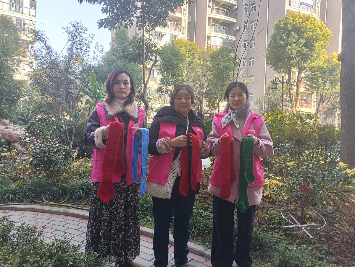 为营造浓厚的爱心氛围,社区专门设置了公益编织活动现场,五彩斑斓的毛线团整齐摆放,银针在巾帼志愿者们手中灵活穿梭,勾勒出温暖的轮廓。社区志愿者们相互交流编织技巧、切磋针法,有经验的志愿者主动指导新手,活动室里暖意融融、其乐融融。如今,袁婆婆及其他志愿者织好的围巾已整齐叠放,红色的热烈、蓝色的清新、黄色的明亮,每一条都针脚细密、质地柔软,承载着社区志愿者们的深情,更凝聚着都市桃源社区的温情。