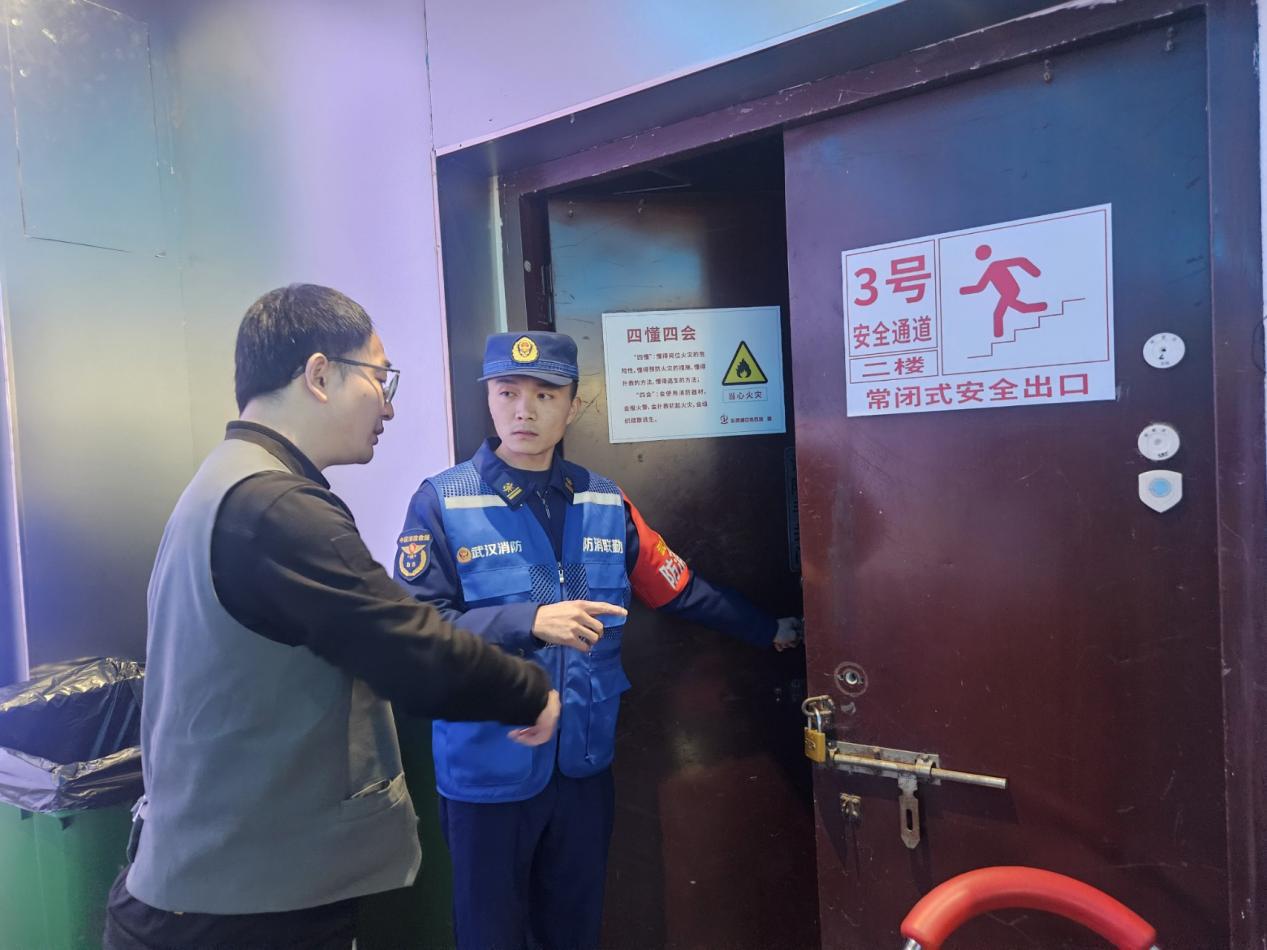 “常闭式防火门既要保持常闭状态以阻隔烟火,也必须确保能够随时推开,便于紧急逃生。加装门闩是绝对不允许的。”在东西湖区,消防员走进田园街,重点对沿街商铺的消防器材配备、电气线路安全及室内外消火栓功能等情况逐一排查。其间,消防员发现部分常闭式防火门存在上锁现象,立即现场指出隐患,并向相关责任人详细讲解常闭式防火门的重要性,要求其切实履行消防安全职责,确保“生命通道”时刻保持畅通。