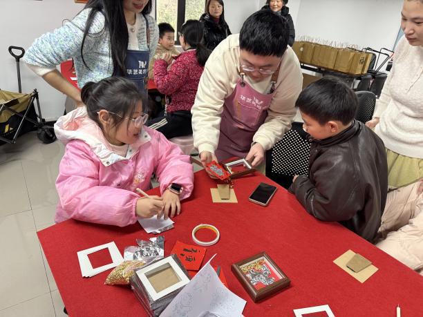 民俗活动区是本次活动的热门区域,湖北省文联民协理事会理事荣正茂老师化身新春财神爷,他挥毫泼墨,为居民送上专属新春祝福。只见他凝神挥笔,笔走龙蛇间,寓意美好的“福”字跃然纸上,墨香四溢。除此之外,居民们还体验了非遗拓印,脸上洋溢着喜庆的笑容。