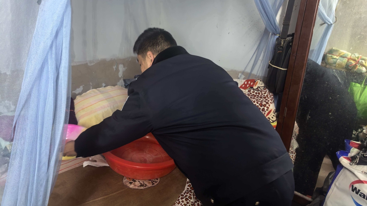 接到报警后,武东街派出所值班民警彭泉宏、辅警贺卫东火速赶往现场处置。抵达婆婆家后,民警、辅警发现婆婆家中遍地摆满脸盆、水桶接水,几处漏水严重处甚至形成了“瀑布”,其中床铺区域积水尤为严重,被褥都可以拧出水来。