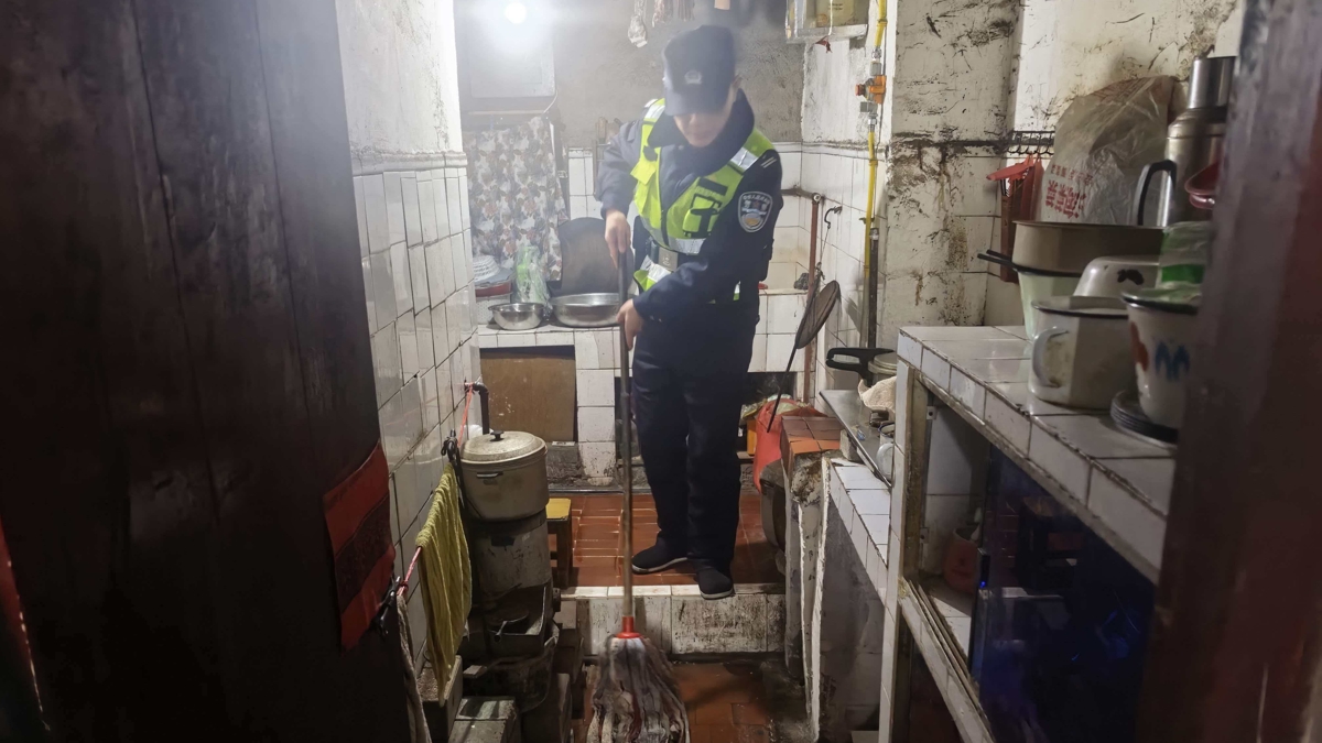 很快,三楼住户赶回家中,开门后发现自家同样积水严重。经细致排查,民警最终确定漏水点为厨房洗菜池水管——因房屋建成年代较久、设施老化,加之此前连日大雪、气温骤降,导致水管冻裂,从而造成了此次漏水险情。