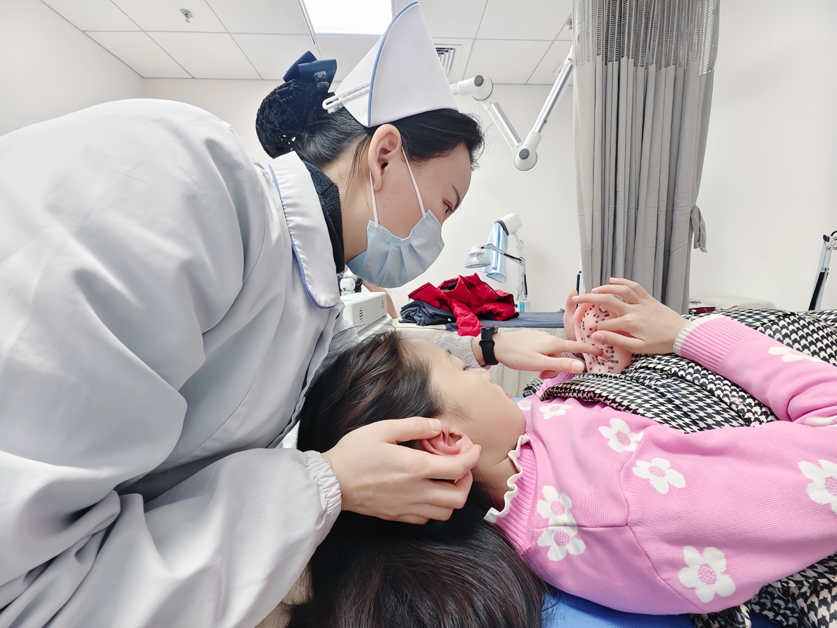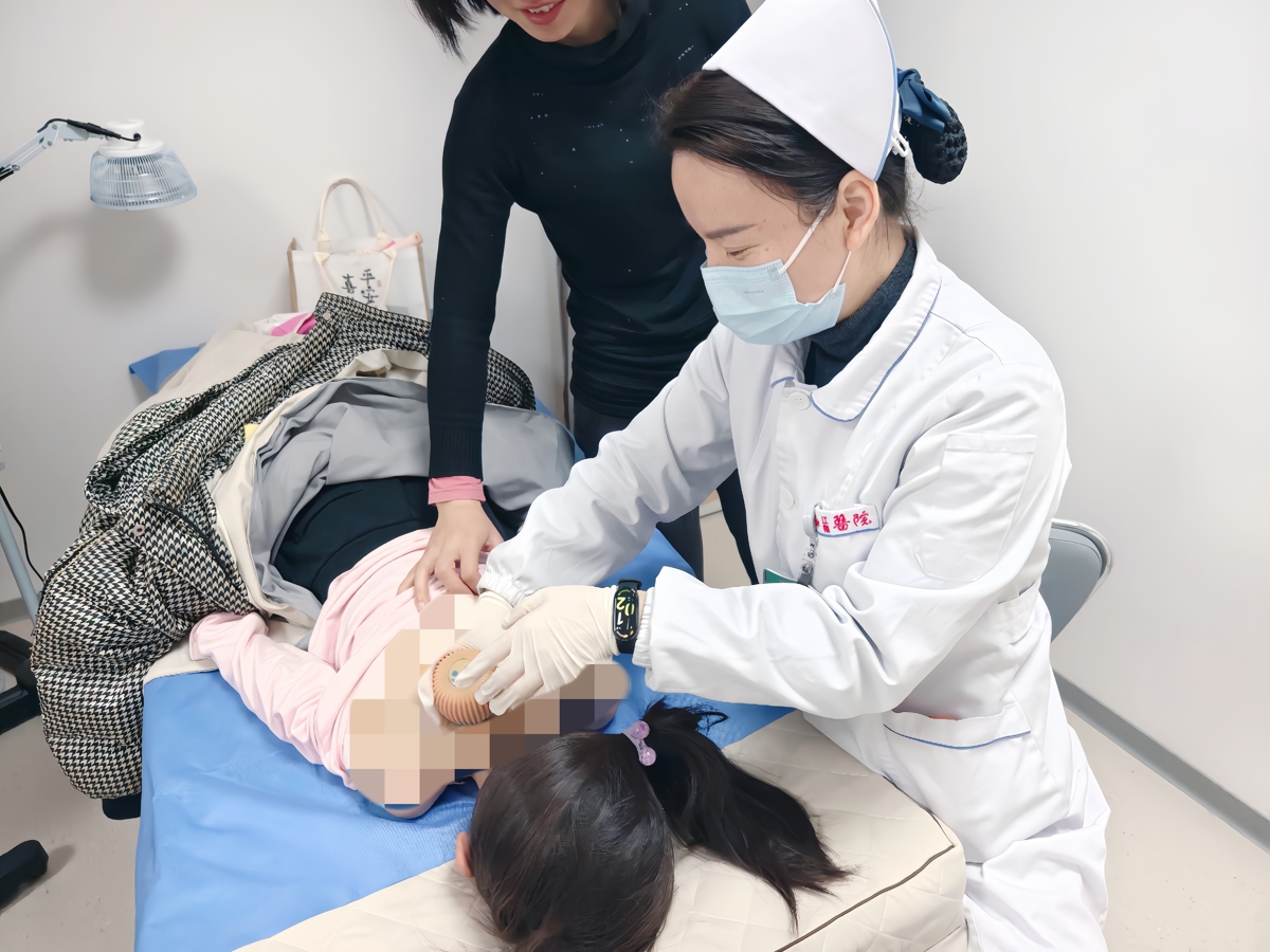 在专业而轻柔的操作手法下,昕昕不仅没有哭闹,反而发出了咯咯的笑声。只见主管护师朱艳先为昕昕进行了耳穴贴压,在耳朵的肺、脾、神门等反射区贴上“耳穴贴”(“王不留行籽”耳贴)。“可通过持续轻柔的刺激,达到宣肺止咳、宁心安神的疗效。”朱艳一边操作,一边耐心解释道。“暖暖的,很舒服。”随后,朱艳为昕昕做了“火龙罐”疗法,艾草氤氲、罐体轻柔走穴,持续温热渗透肌肤,昕昕不时发出“咯咯咯”的笑声,跟妈妈分享着新鲜的“体验”。