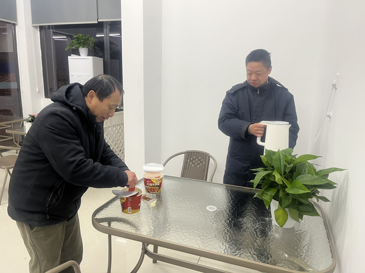 张俊(右一)为杨先生(左一)送来热水和泡面