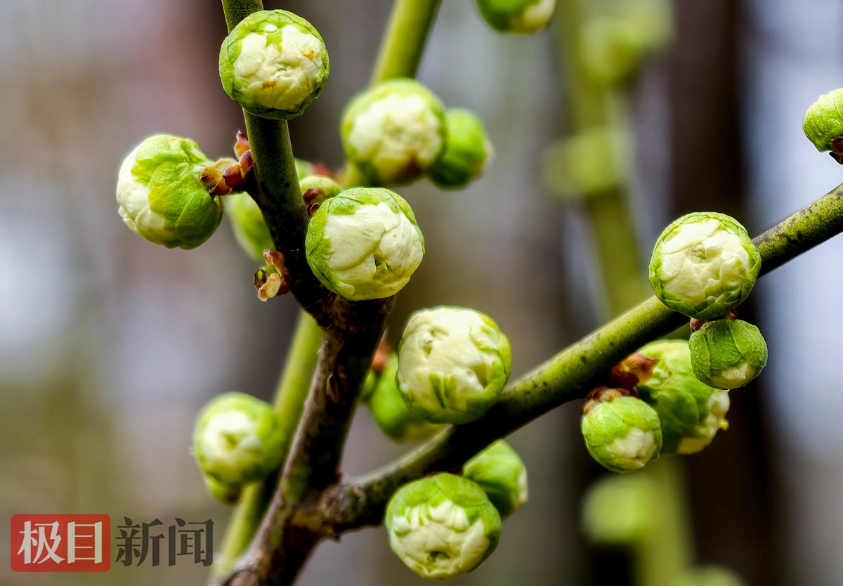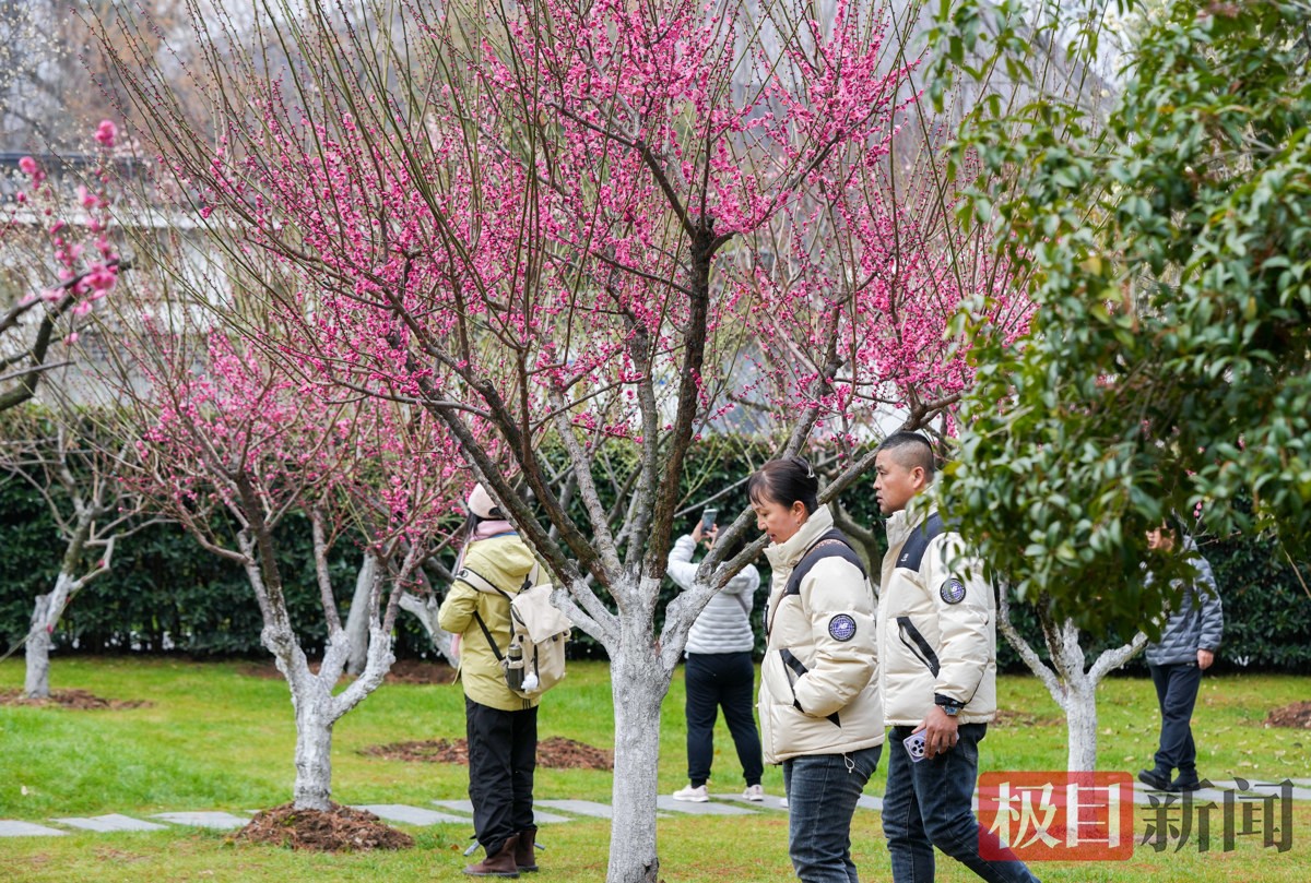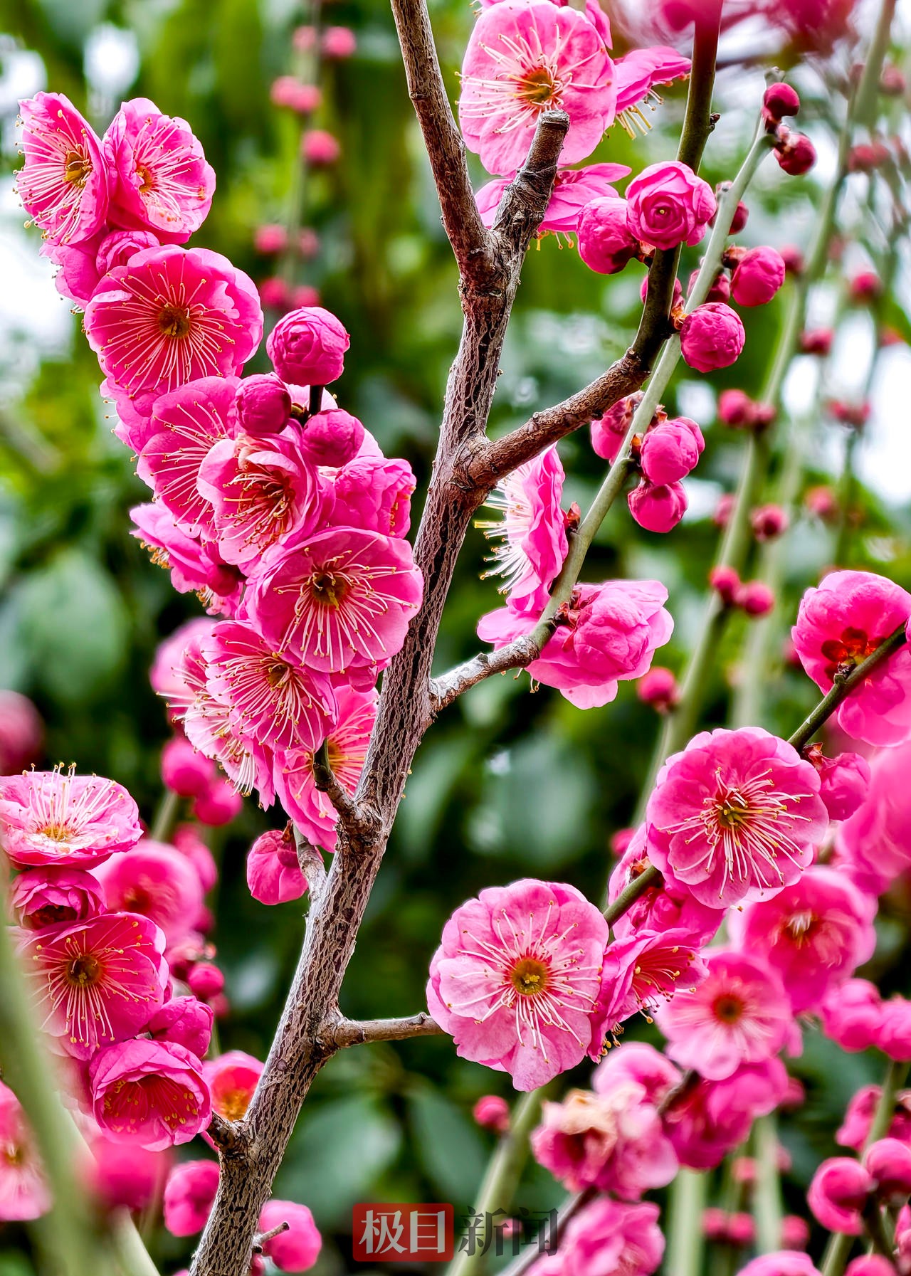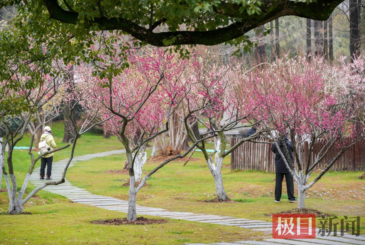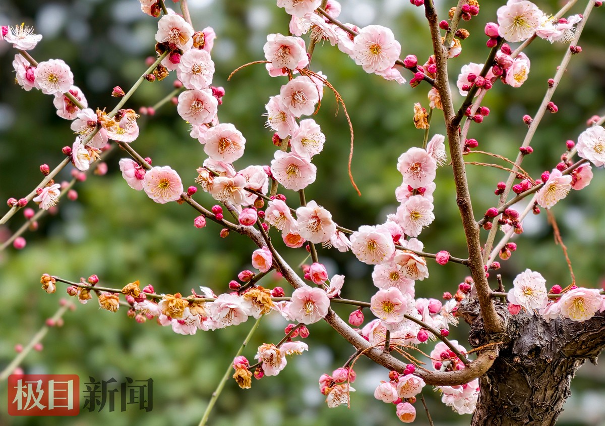 当天上午,新闻记者现场看到,58亩坡地被各色梅花装点得灿若烟霞。绿萼梅缀着晶莹水珠,素白花瓣透着清雅暗香;铁梗红枝干遒劲,艳红花朵热烈奔放;粉黛阁层层叠叠,嫩粉花瓣如少女含羞;送春梅繁密枝头,半粉半白的花姿别具韵味。雨后初晴的阳光洒在花枝间,光影斑驳,梅香在清新空气中愈发清冽。市民游客或举着手机定格花影,或携家人在梅林间漫步,孩童追着花香奔跑,摄影爱好者架起设备捕捉光影下的梅韵。