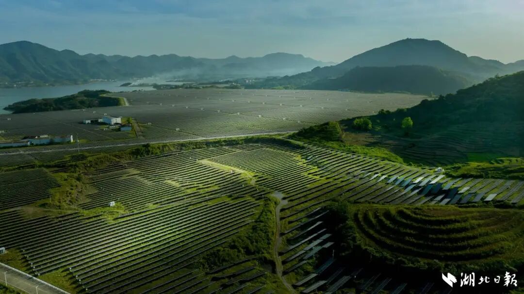 占地3180亩的大畈光伏电站总装机规模17万千瓦,是华中地区最大的单体光伏发电站,53.8万块光伏板每年输送绿电1.79亿千瓦时,满足12万户家庭全年用电需求。
