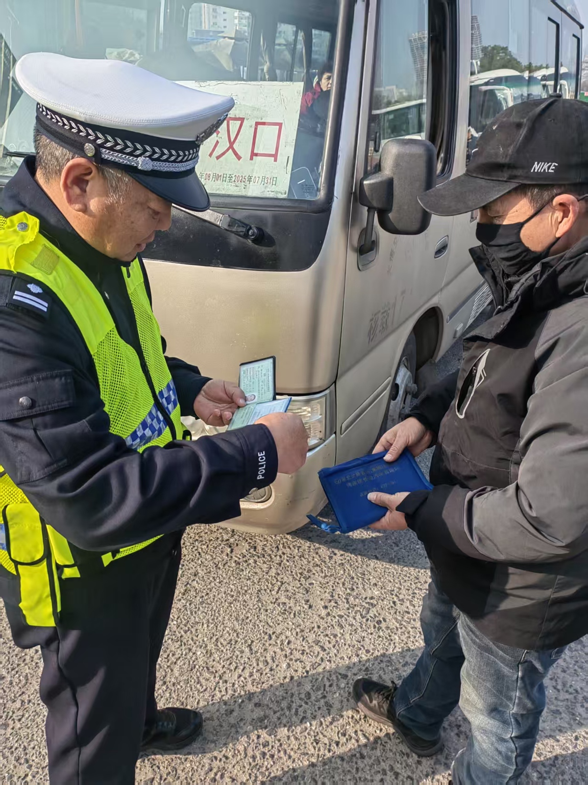 在王家墩客运站,车管中队民警邱文杰重点对站内待发客运车辆开展安全专项检查,逐一核查车辆轮胎、制动系统、灯光设备、灭火器等关键部位和应急设施的完好情况,对检查中发现的隐患当场督促整改,坚决杜绝“带病车辆”上路行驶。发车前,民警登车向驾驶员和乘客开展交通安全宣讲,结合典型交通事故案例,以案释法讲解安全出行注意事项,反复提醒驾驶员谨慎驾驶、文明行车,叮嘱乘客全程系好安全带,确保自身安全。