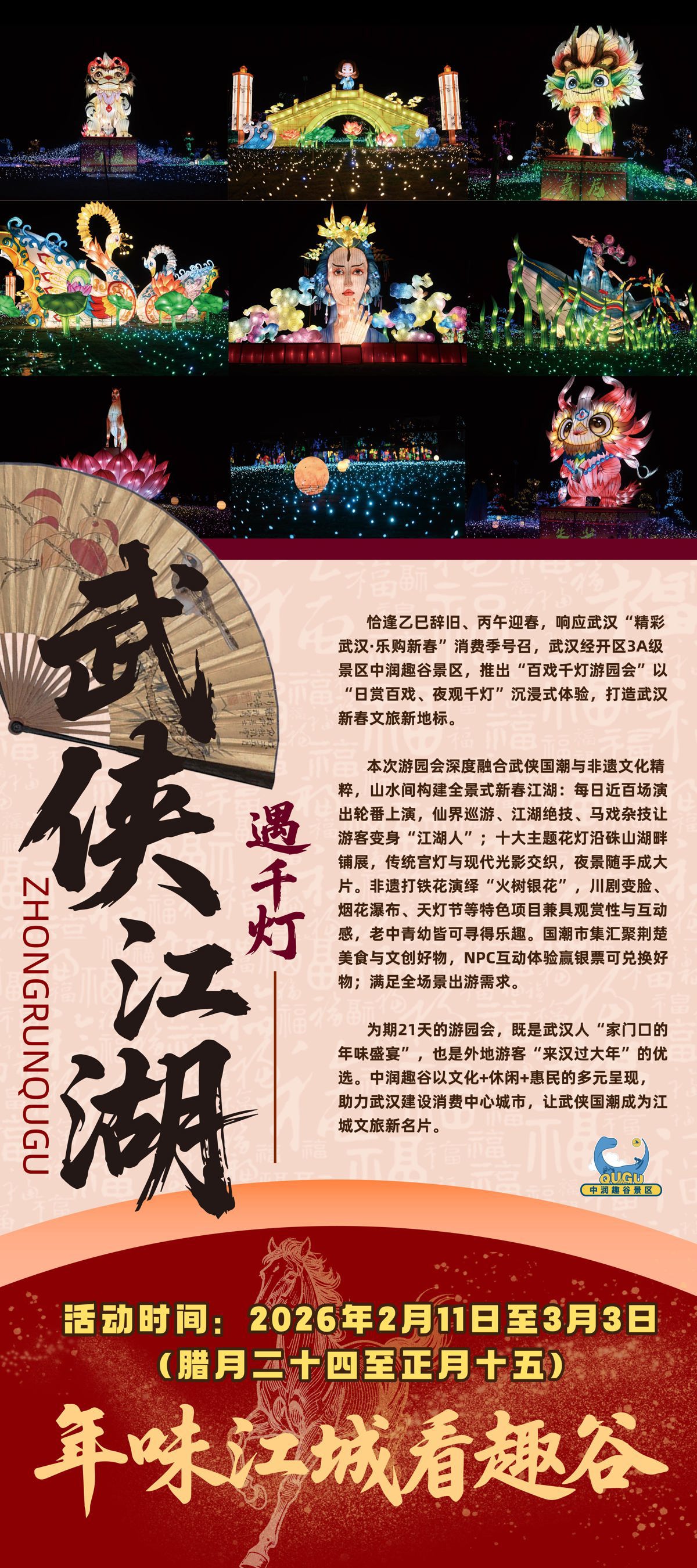 新闻记者从武汉经开区文旅局获悉,该区多个景区也将开展丰富多彩的文旅活动。2月10日至3月3日,中润趣谷景区推出“仙谷奇侠·趣玩幻城”春节主题系列活动,吸引众多外地游客群体参与其中。春节期间,龙灵山生态公园开展“趣游龙灵”活动并配套多项优惠,硃山渔乐体育公园推出“围炉煮茶节”“垂钓嘉年华”“萌宠迎新春”等系列特色活动。兰岛都市田园综合体开展年野草地节、艺术典藏展及非遗文化体验等活动,丰富在地文化休闲内容;官莲湖海图农园推出露营休闲、马术体验与生态采摘等项目,打造亲近自然的田园生活方式。
