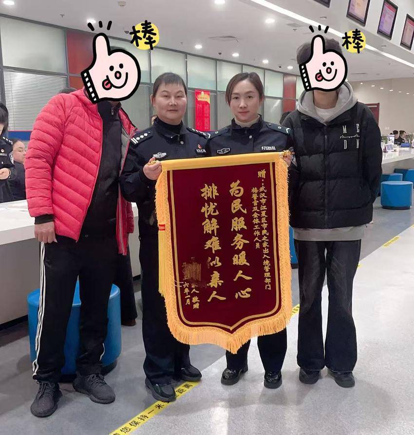 1月 29日,王先生带着儿子专程来到江夏市民之家,将一面写有“为民服务暖人心,排忧解难似亲人”的锦旗送到梅爱萍手中,紧紧握住她的双手再三致谢:“多亏了梅警官的热心帮助,帮我们解决了大难题,我才能和儿子早日团聚,真的太感谢您了!”