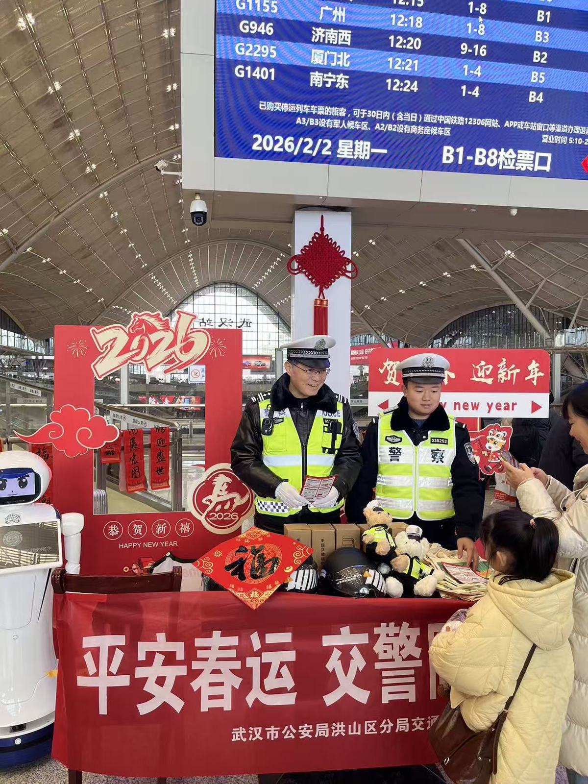 2月2日,农历马年春运大幕正式拉开,为期40天的春运征程(2月2日至3月13日)就此开启。当天,“新春送暖 骐骥驰骋——2026年温暖回家路”大型公益活动在汉口火车站广场举行,武汉交警携手相关单位,以实际行动为旅客送上新春祝福与安全守护。