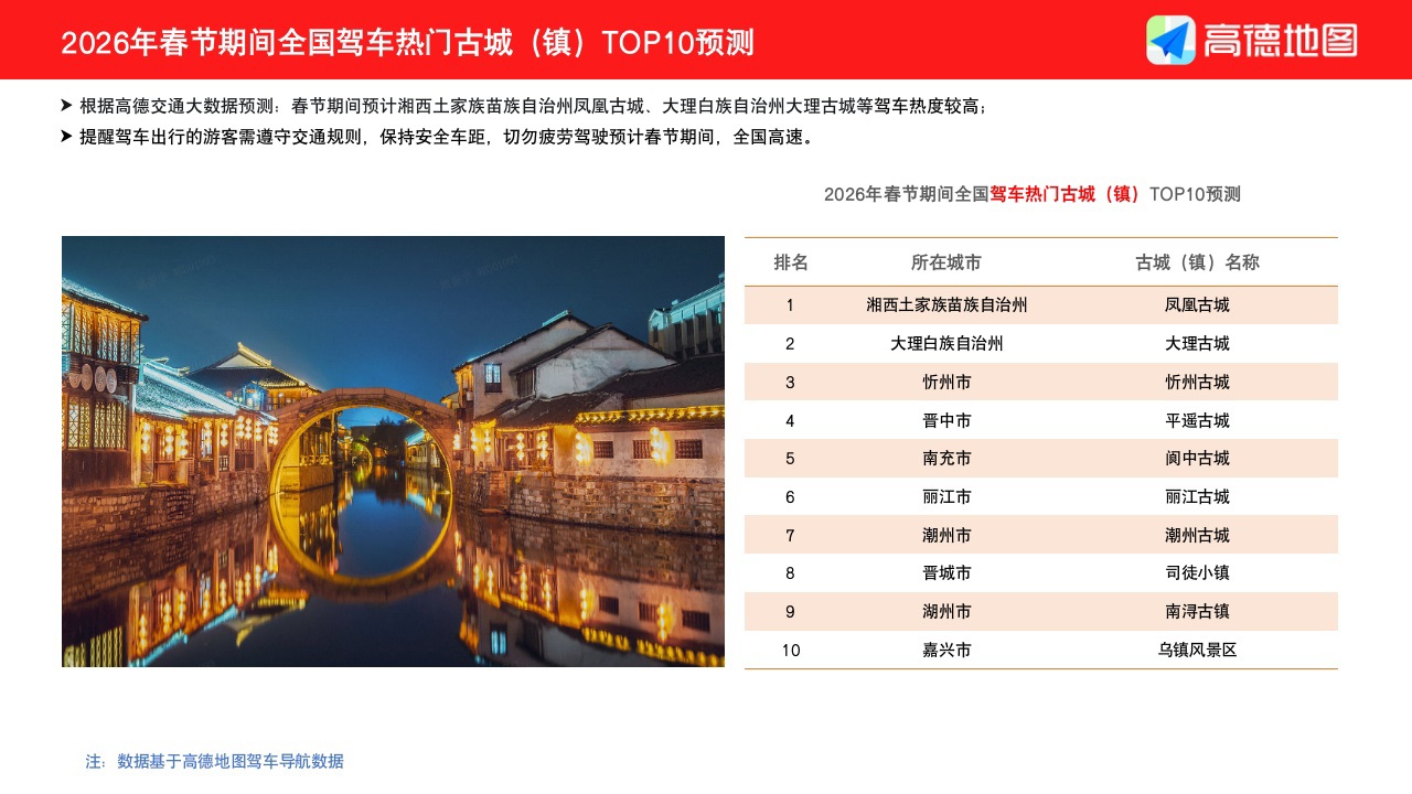 除了传统的返乡团圆,今年的“旅行过年”也呈现出鲜明的主题化特征。报告预测,广州、重庆、成都、北京、杭州等将成为十大热门自驾游城市,而在目的地选择上,则呈现出三大热门主题: