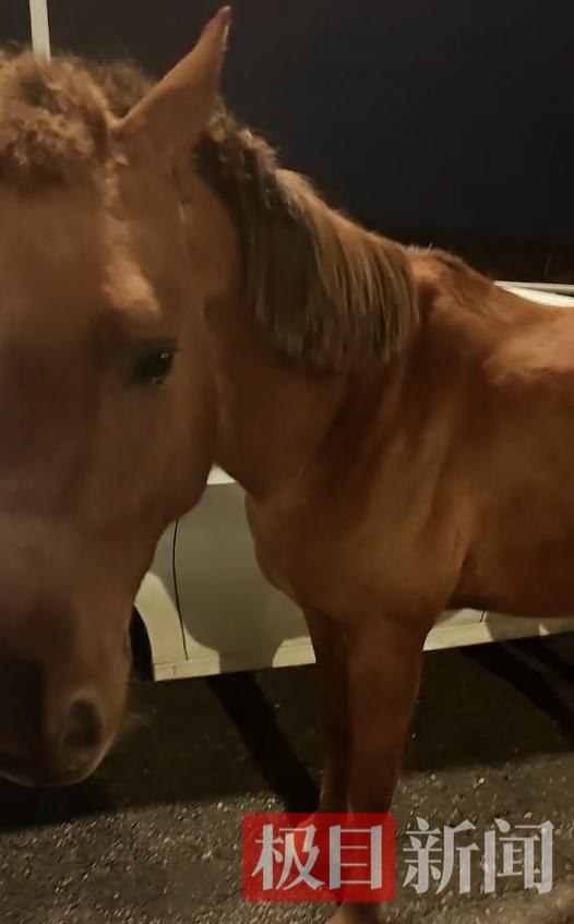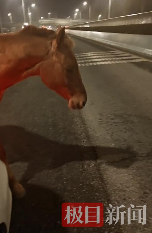 “半夜光线有点暗,我一开始以为是有人半夜在高架上步行,想着这么晚太危险了,就放慢车速慢慢靠近。”等驾车靠近后,小吴愣住了:竟然是一匹马正在高架上溜达,步伐悠闲,身上没有牵马绳。担心后方来车来不及避让会撞到这匹马,小吴来不及多想,立刻在马身后安全位置停车,同时打开双闪,防止后方来车撞上马儿。