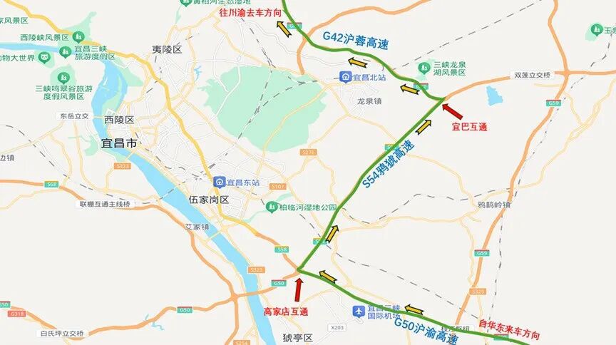 经G50沪渝高速高家店互通(宜昌市猇亭区境内)转S54鸦猇高速至G42沪蓉高速前往川渝。