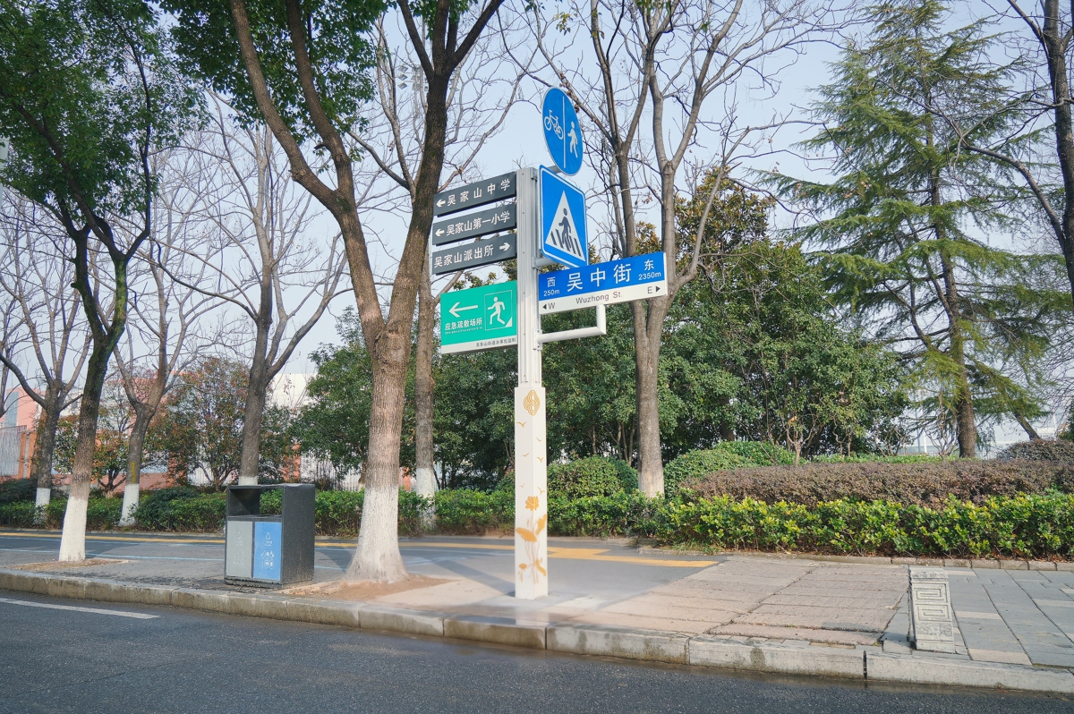 比如在山北路口,杆子上新增了前往吴家山公园、区中医院、区妇幼等地的方向指引;在吴家山中学门口,补充了吴家山小学、初级中学等周边学校的导引信息,同时将原有的禁停、限速等交通标识进行共享。一根杆子,从原本单一功能的“指示牌”变成了集导航指引、公共服务提示等于一体的多功能“服务杆”。这种“多杆合一”瘦身,不仅视觉上清爽开阔,更直接释放了人行空间,真正实现“还路于民”。