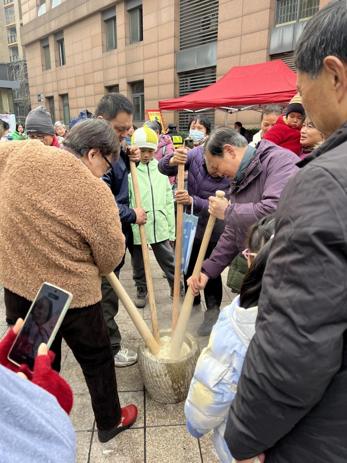 随后的亲子打糍粑活动热闹非凡,家庭成员们协力协作,在富有节奏的捶打声中,共同体验传统美食制作的乐趣与亲情协作的温馨。一旁的写春联、拓印福字区域墨香四溢,居民们挥毫泼墨,将一副副承载着美好祝愿的春联和“福”字带回家,寓意迎新纳福。