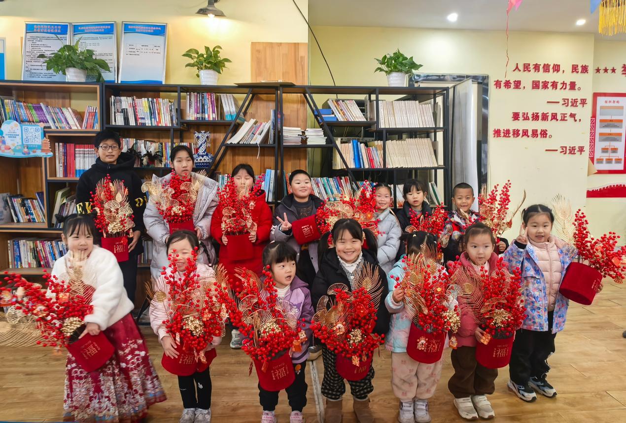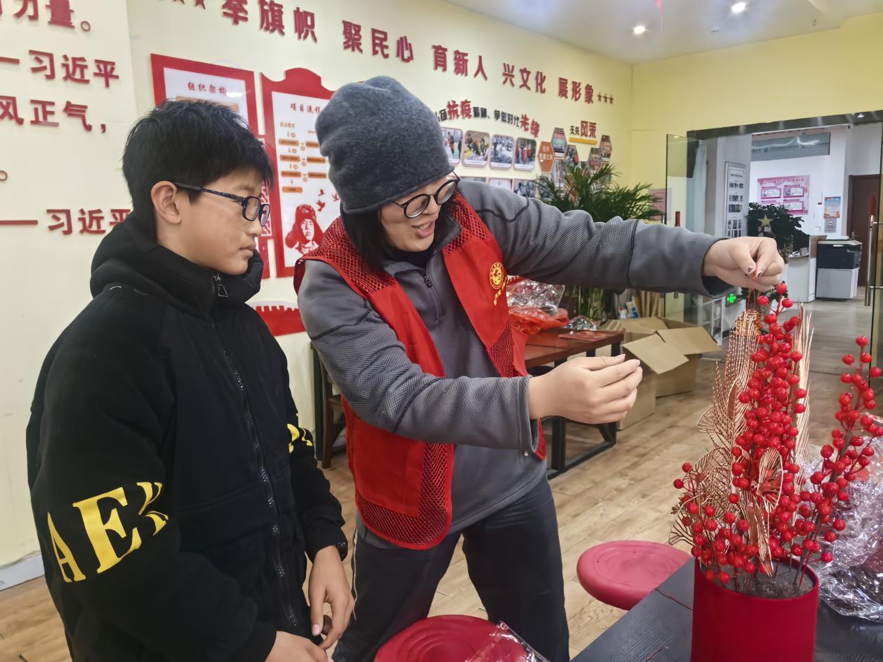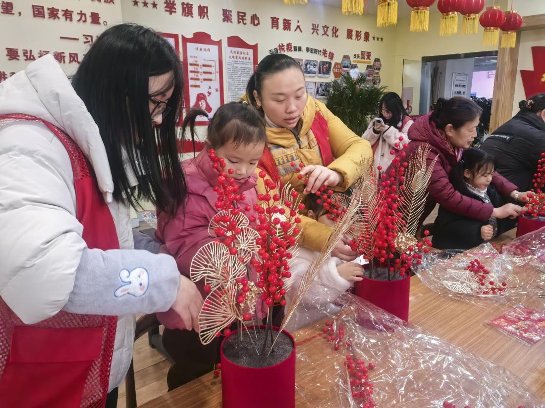 在社区新时代文明实践站,活动现场布置得温馨而喜庆。桌上有序地排列着各类基础材料及工具。年宵花材多样,装饰配件更是琳琅满目,小灯笼挂饰、福字、丝带等一应俱全,仿佛在诉说着新春的美好愿景。