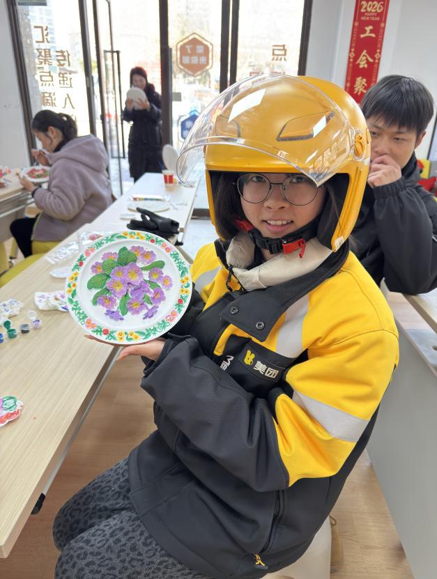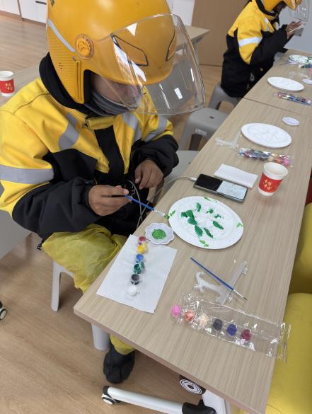 随后的互动体验环节中,驿站负责人为参与者们简要介绍了色彩原理及色块搭配经验,依托立体石膏花盘填涂手工制作,引导新就业群体及户外工作者全身心投入创作,在色彩搭配和水粉交融中,初步掌握通过艺术表达释放压力、调节情绪的方法。