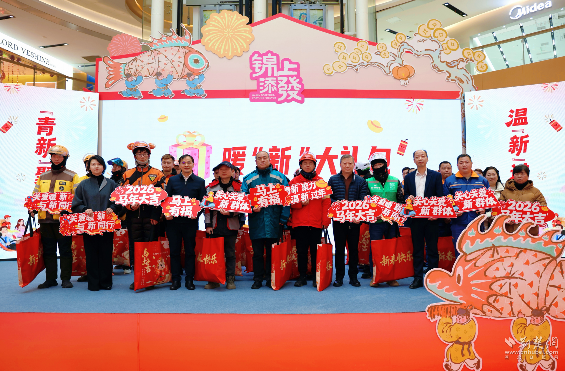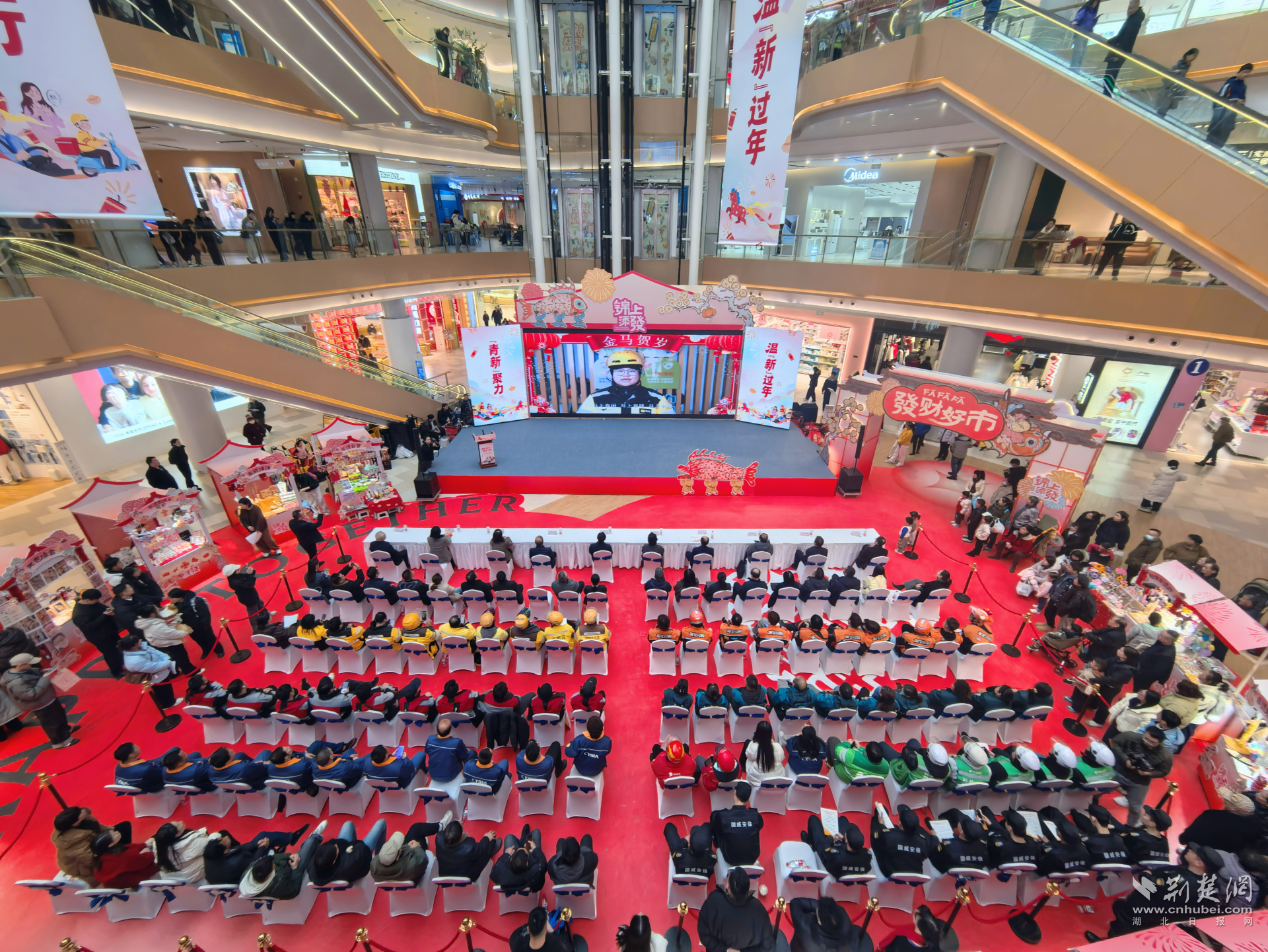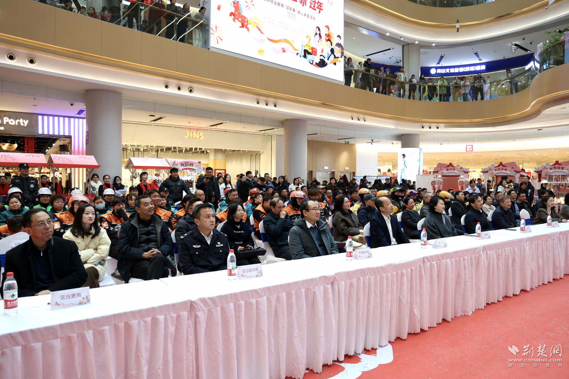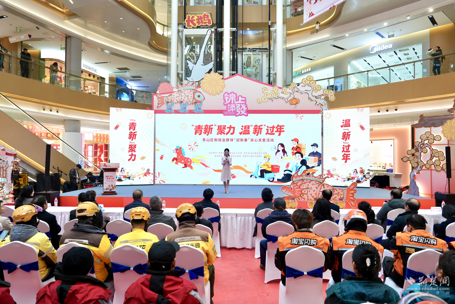 荆楚网(湖北日报网)讯(记者成超 通讯员田晨希 张勇 视频何琛)新春将至,情暖青山。为深入学习贯彻习近平总书记关于社会工作的重要指示精神,落实对新就业群体的关怀要求,2月3日下午,由中共武汉市委社会工作部、中共青山区委社会工作部主办,新沟桥街道办事处、荆楚网(湖北日报网)承办的“‘青新’聚力 温‘新’过年——青山区新就业群体‘迎新春’关心关爱活动”在武汉青山印象城举行,80余名外卖骑手、快递小哥、网约车司机、货车司机等新就业群体代表和物业保安代表们参加活动。