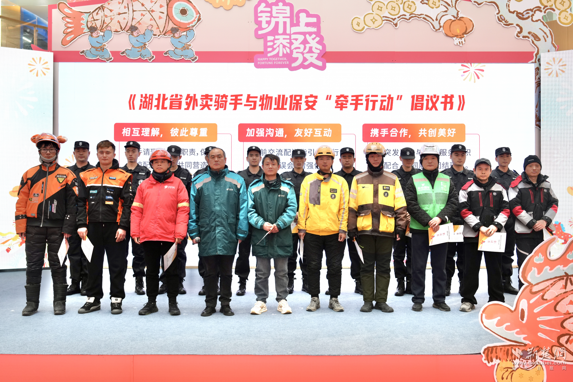 外卖平台骑手代表与物业保安协会代表共同宣读《湖北省外卖骑手与物业保安“牵手行动”倡议书》。通讯员供图