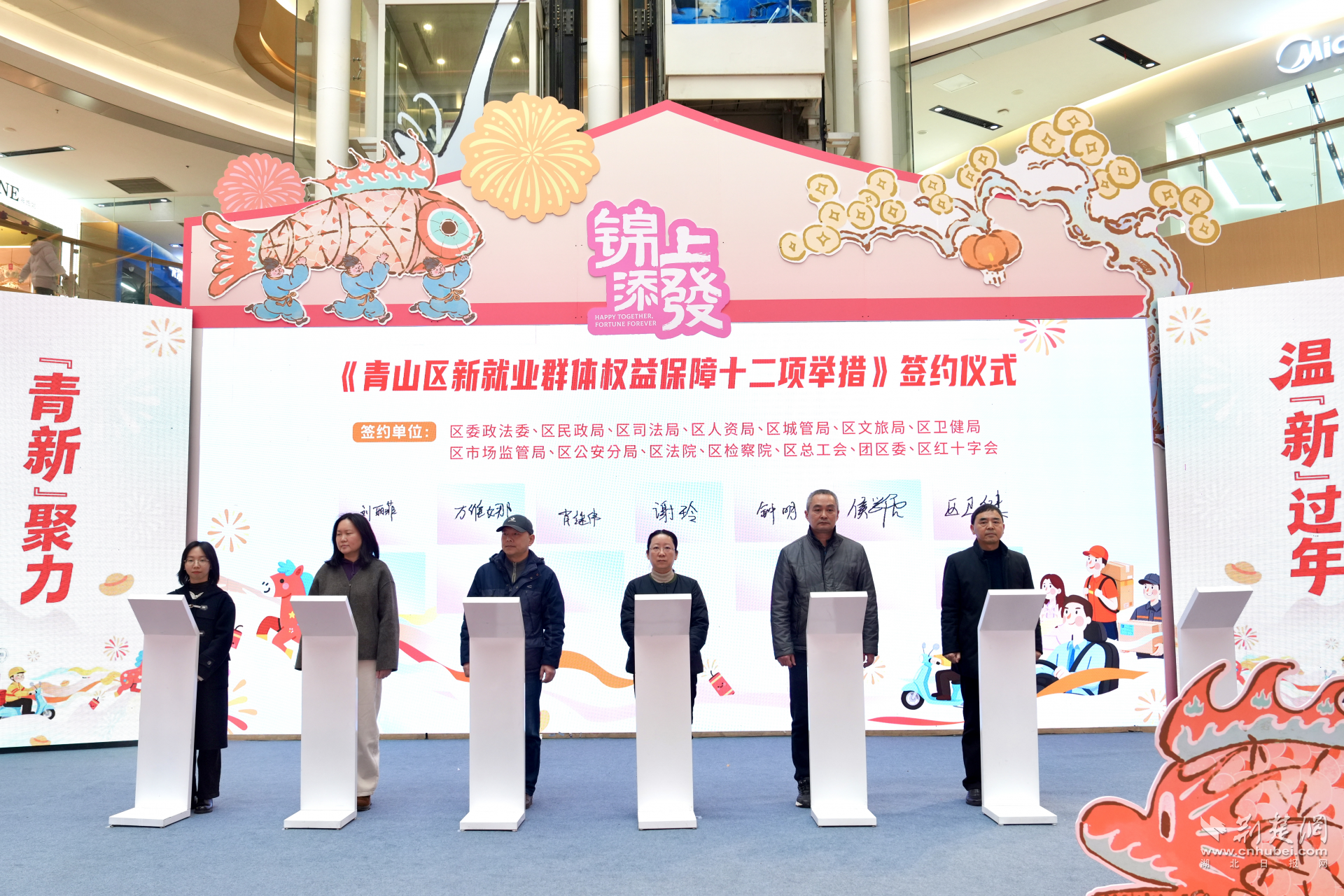 青山区14家职能部门共同签署《青山区新就业群体权益保障十二项举措》合作协议。通讯员供图