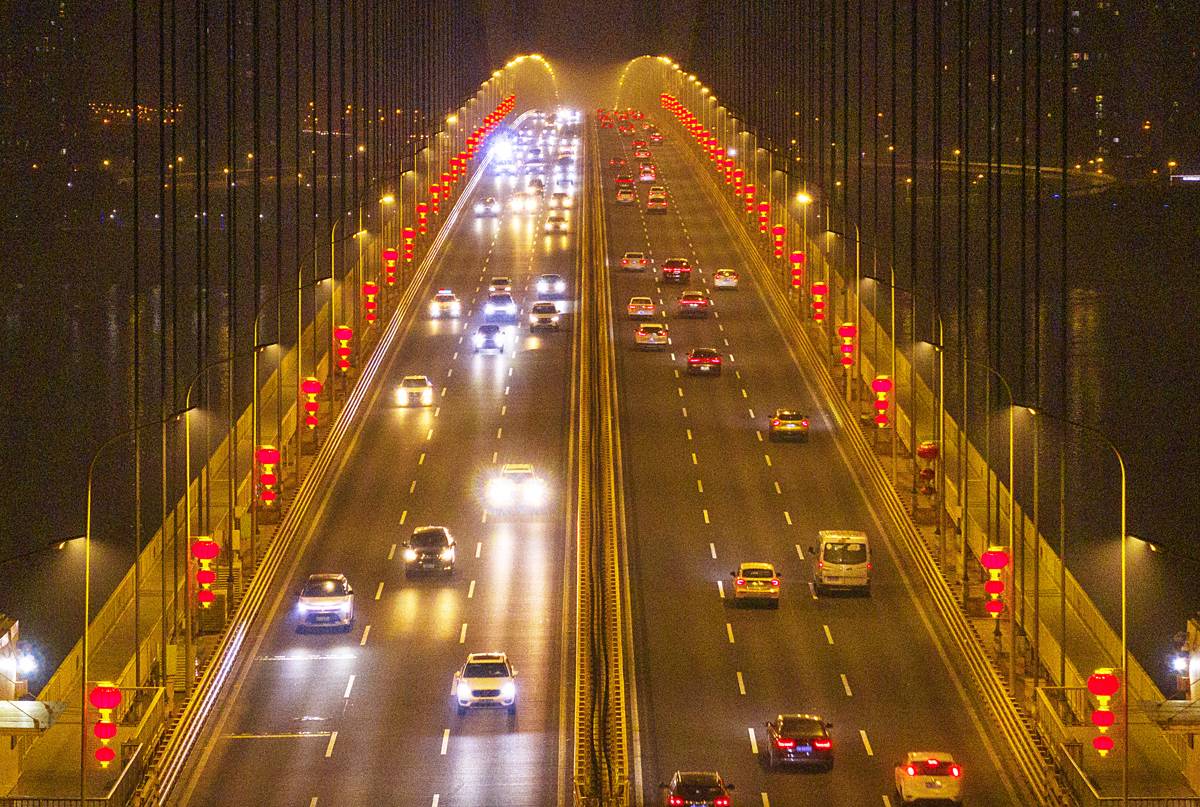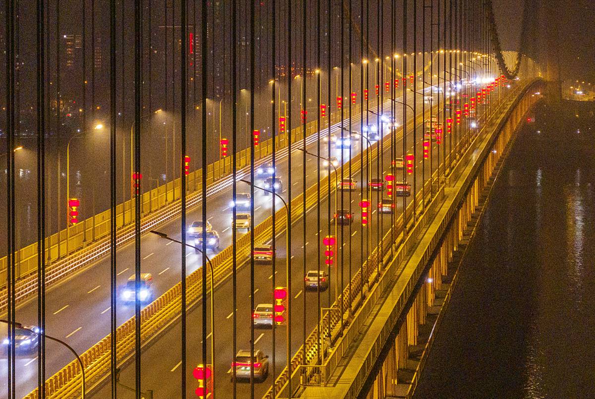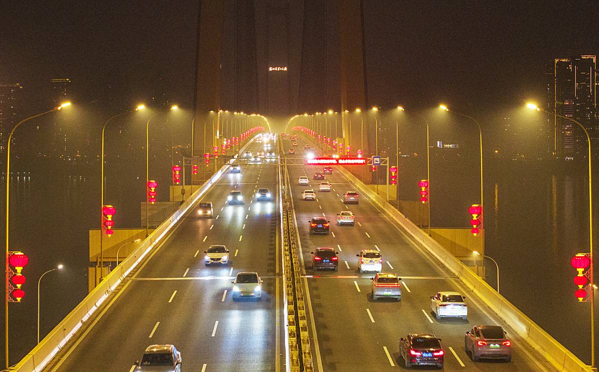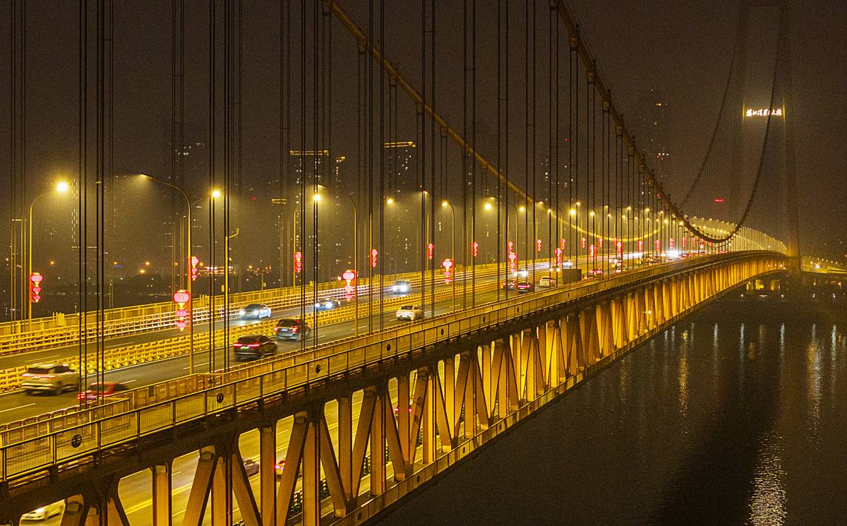 2月4日晚,华灯初上,武汉杨泗港长江大桥两侧的路灯杆上,近千个大红灯笼被点亮,桥上一片火红,宛如一条火巨龙,横跨长江两岸。一抹抹“中国红”不仅点亮了武汉地标,更传递出浓浓年味,为市民提前送上新春祝福。