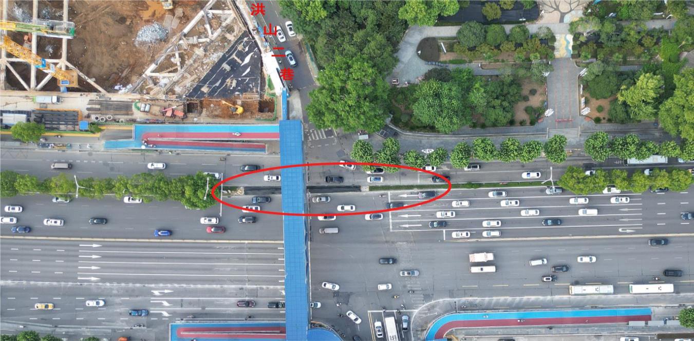 同时,封闭北口主辅绿化带开口,洪山二巷车辆只能右转,减少路口车流交织;配套调整武珞路中南路交通组织,东进口南侧车道(靠近渠化岛)将右转改为右掉,便于洪山二巷出来车辆在此掉头,同步修改分道标志;西进口新增左转待行区,提高左转通行效率;联动控制丁字桥路口与中南路信号灯,优化路口信号配时和车道布置。